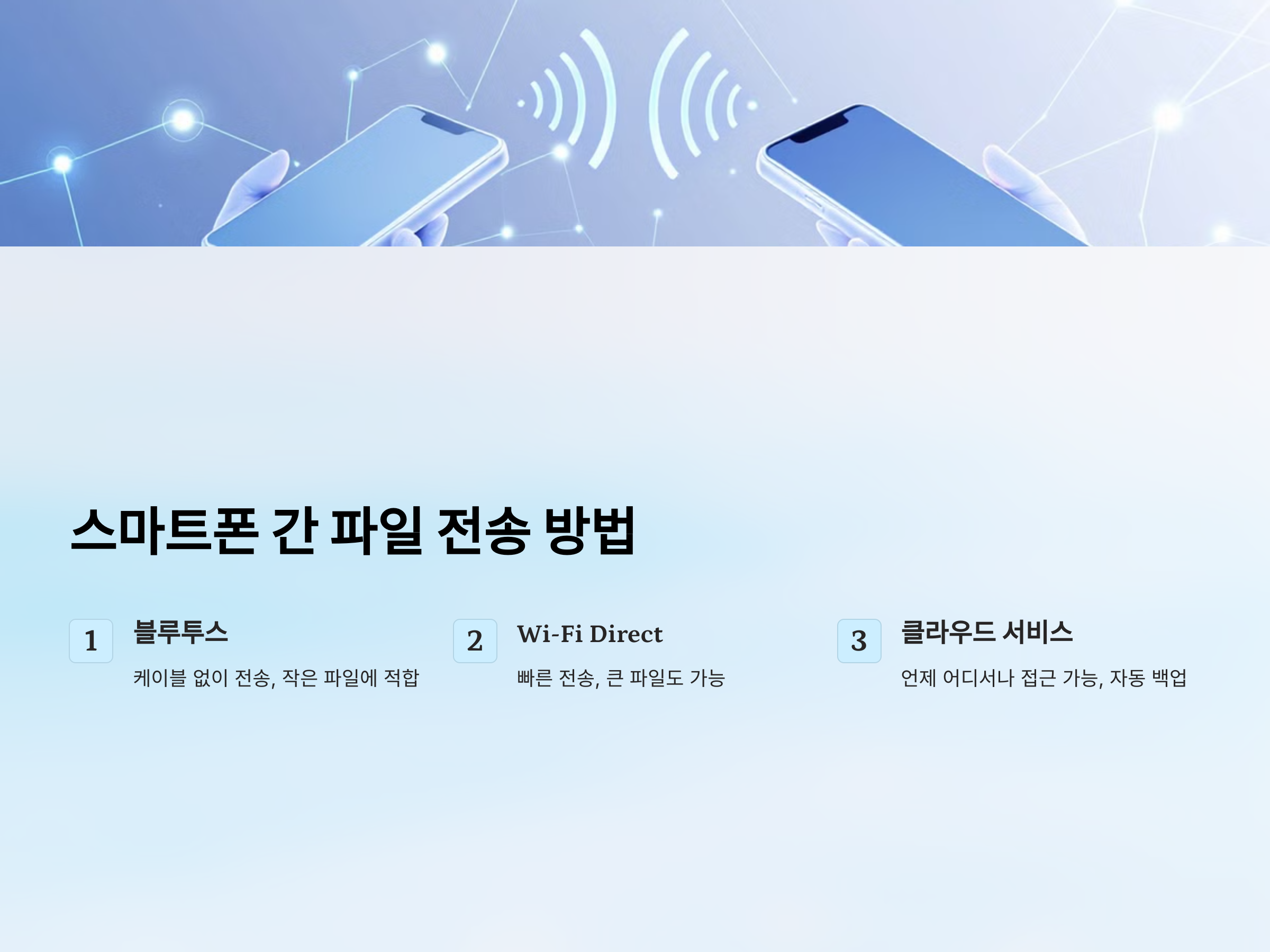 블루투스를 이용한 파일 전송은 물리적인 케이블 없이 파일을 전송할 수 있는 간편한 방법입니다. 두 스마트폰이 서로 가까운 위치에 있을 때 블루투스를 활성화하고 파일을 선택해 전송하는 방식이죠. 다만, 속도가 느릴 수 있기 때문에 작은 파일을 전송할 때 유용합니다.