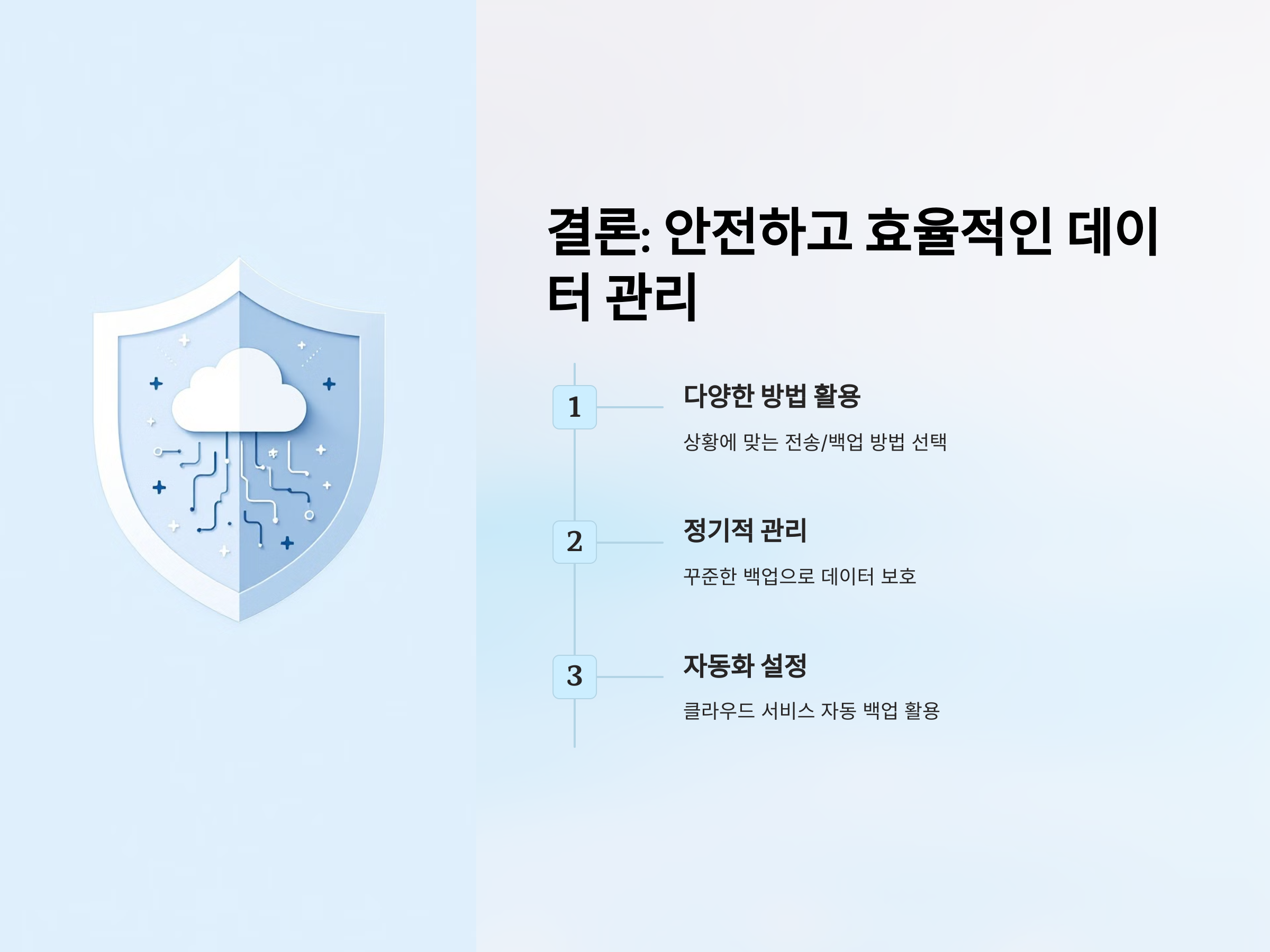 스마트폰에서 파일을 전송하거나 백업하는 것은 이제 더 이상 어렵지 않습니다. 위에서 소개한 방법들을 잘 활용하면 언제 어디서든 데이터를 안전하게 관리하고, 손쉽게 다른 기기로 전송할 수 있습니다. 파일을 전송하고 백업하는 습관을 들여 중요한 데이터를 보호하세요!