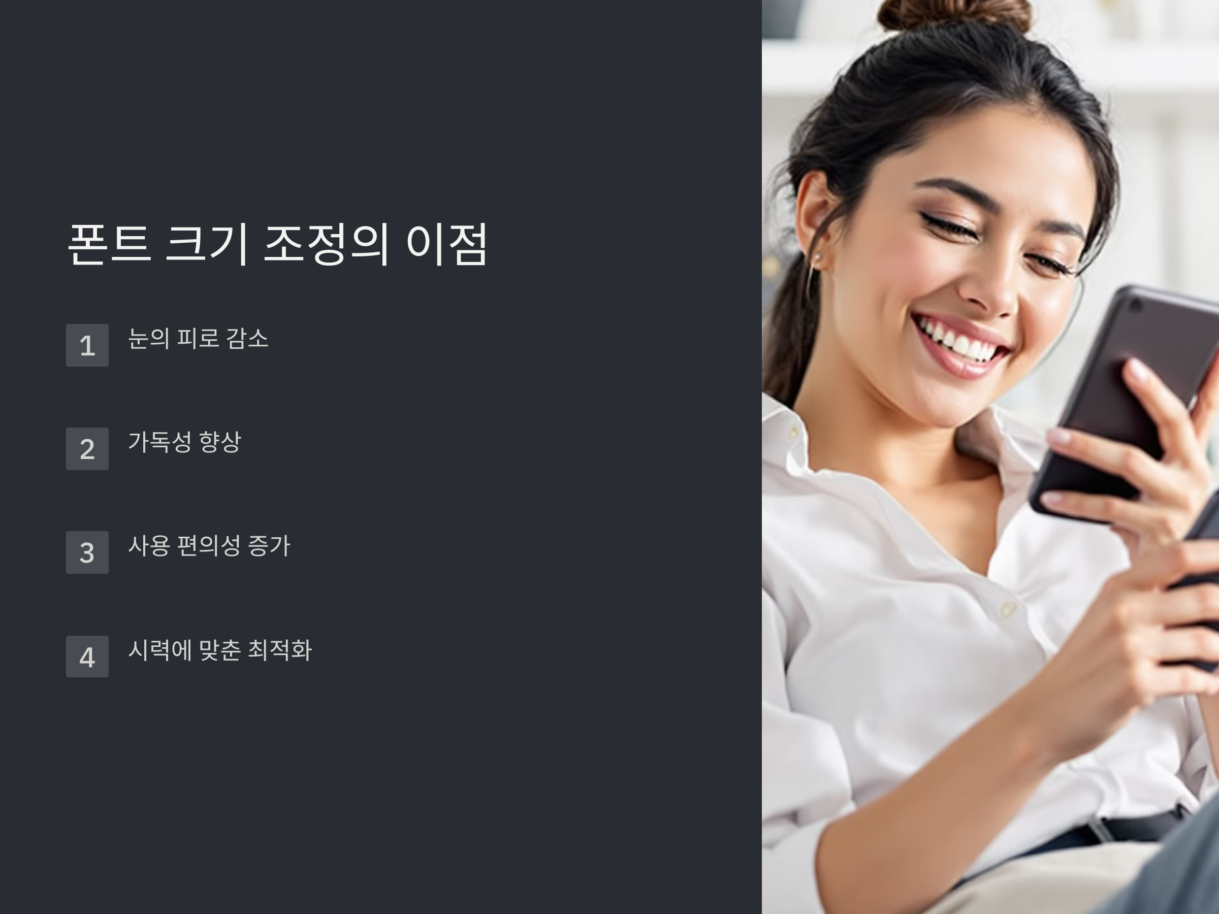 안드로이드 스마트폰에서는 설정에서 글씨 크기를 조정할 수 있습니다. 이 방법을 통해 글자 크기를 크게 조정하여 가독성을 높일 수 있습니다.