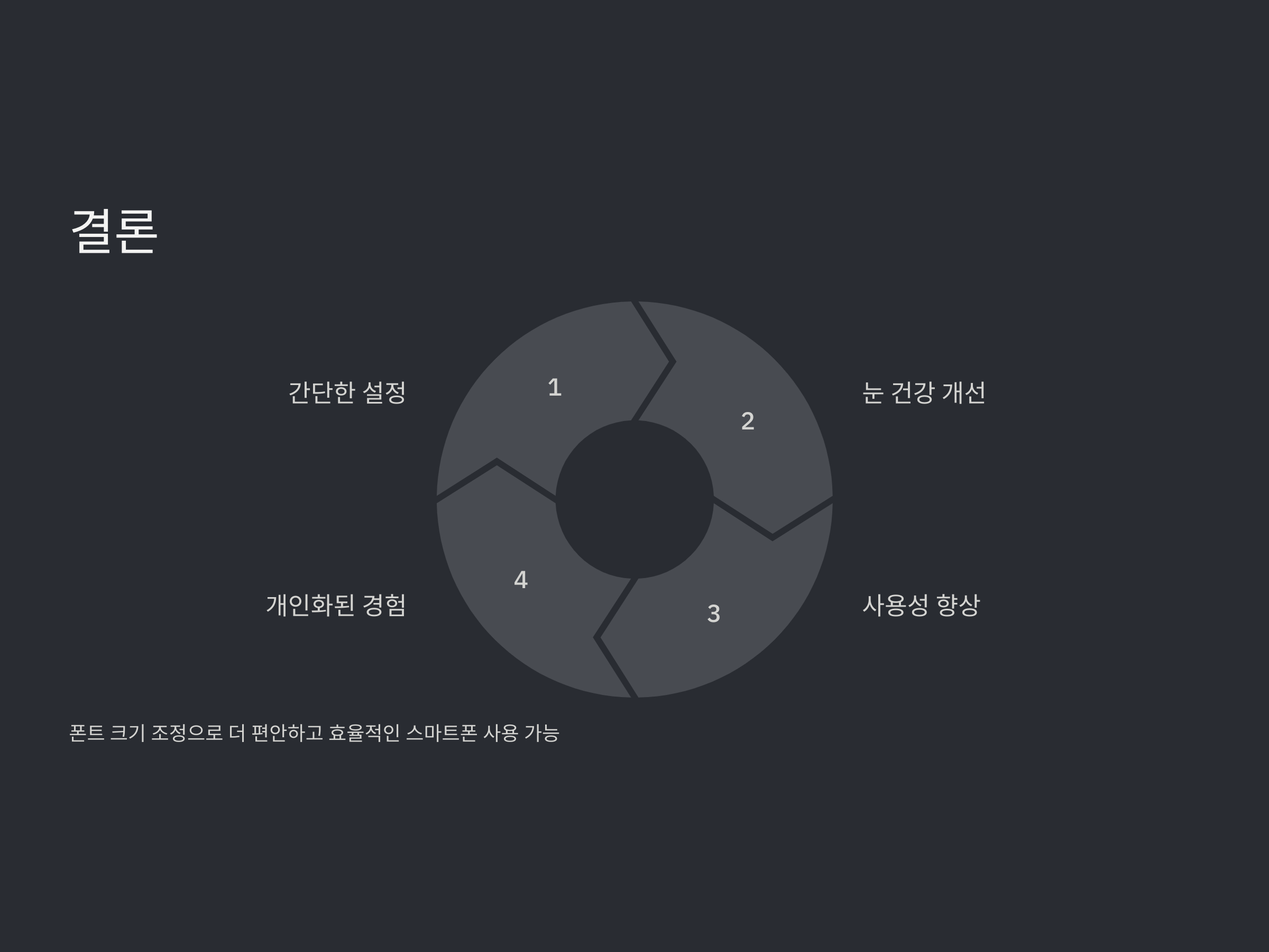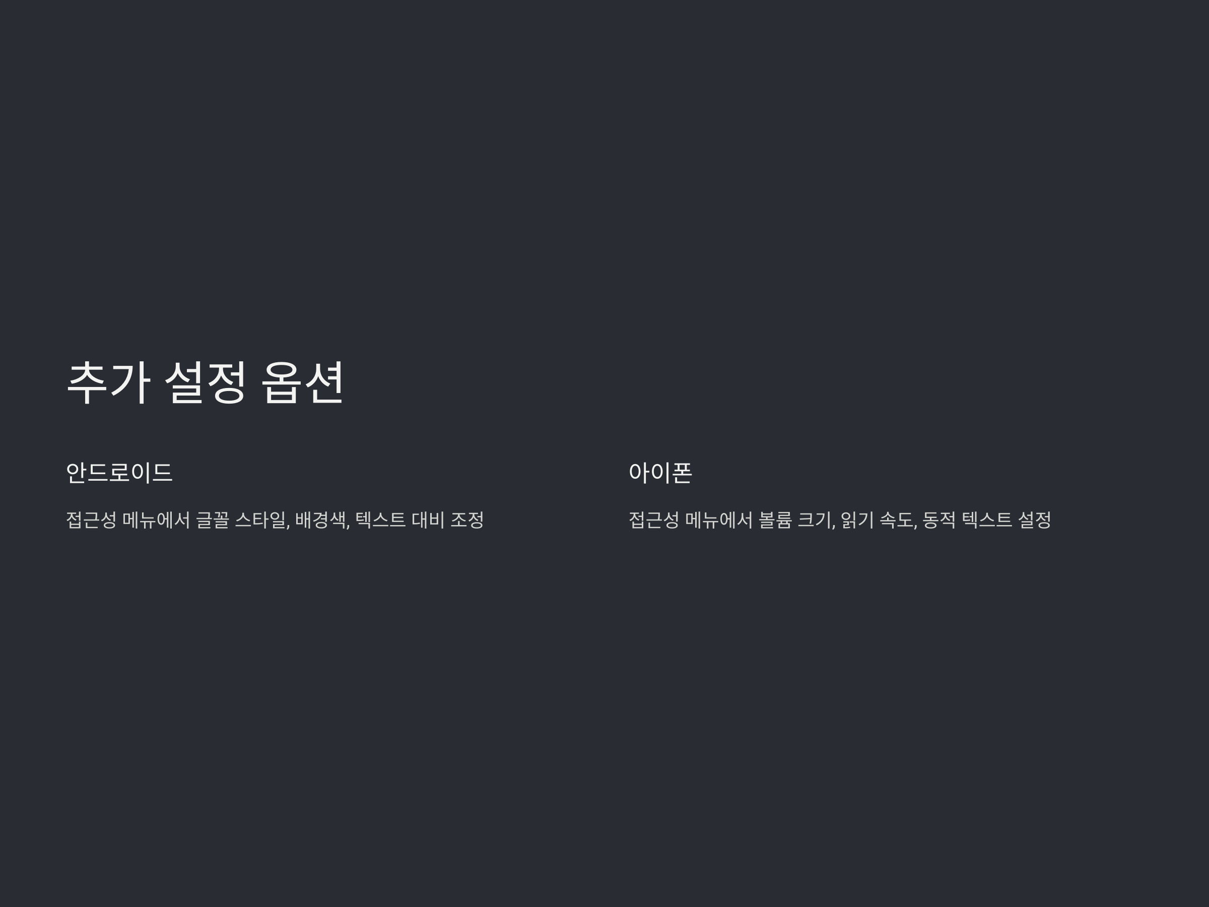 - 접근성 메뉴에서 더 다양한 설정을 할 수 있습니다. 여기서는 글꼴 크기 뿐만 아니라 화면의 배경색, 텍스트 대비 등도 설정할 수 있어 시력에 맞춰 화면을 최적화할 수 있습니다.