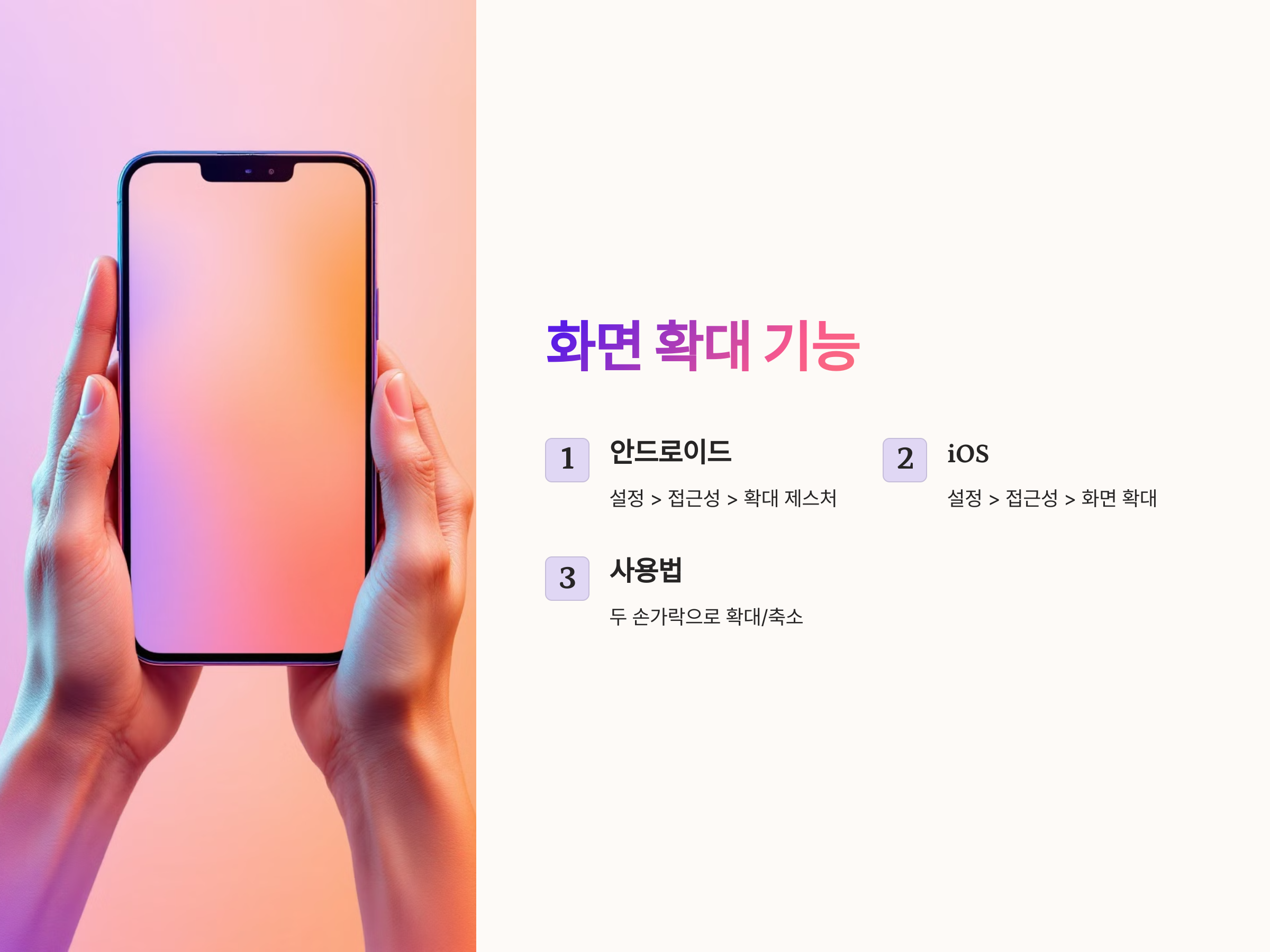 - 확대 제스처를 활성화하고, 화면에서 두 손가락을 이용해 확대/축소할 수 있습니다.
