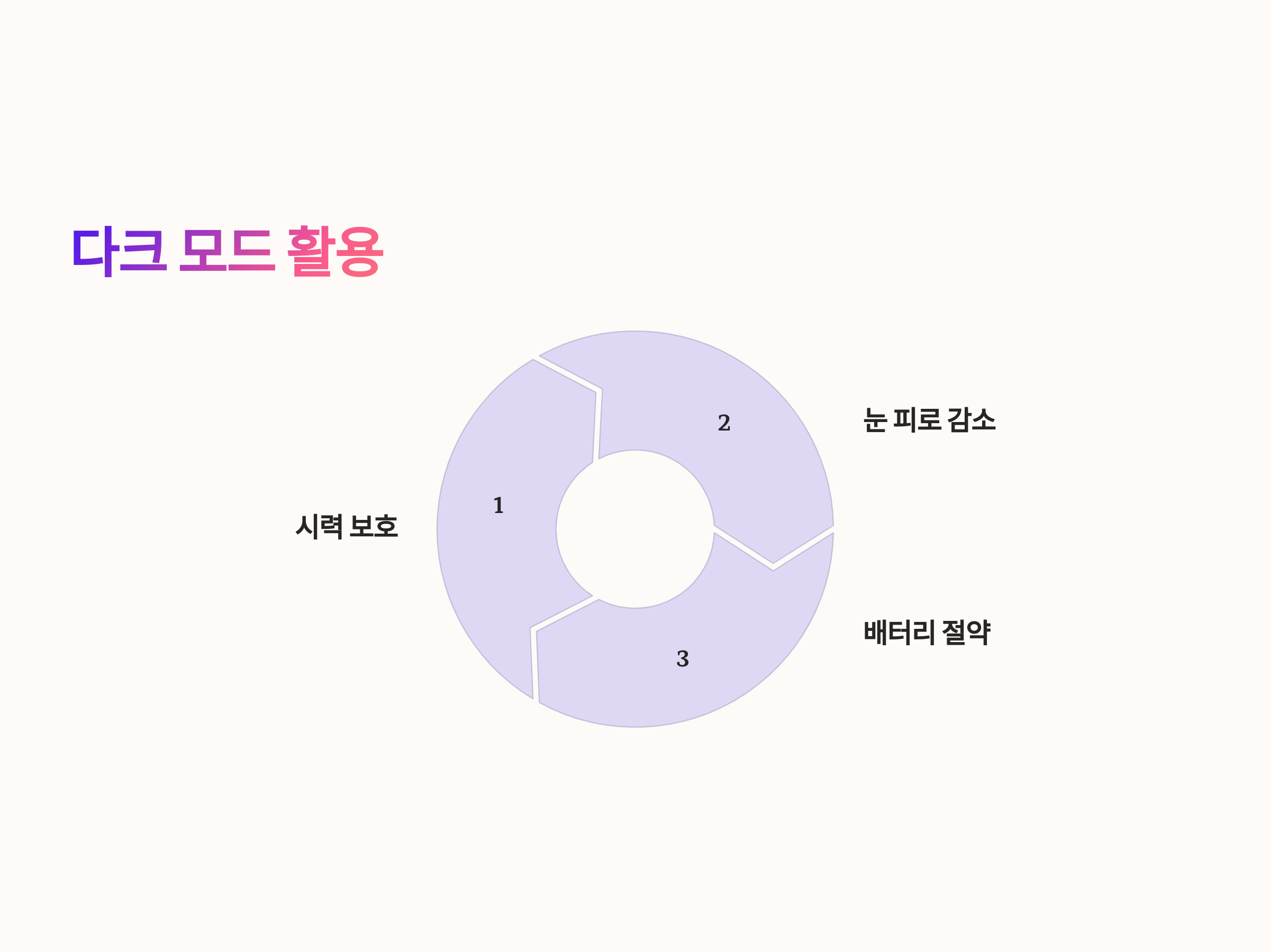 글씨 크기만큼 중요한 것이 바로 화면의 밝기와 색상입니다. 다크 모드를 활용하면 눈에 부담을 줄여줍니다. 다크 모드는 화면의 배경을 어두운 색으로 바꾸어 주기 때문에 시력 보호에 도움이 됩니다.