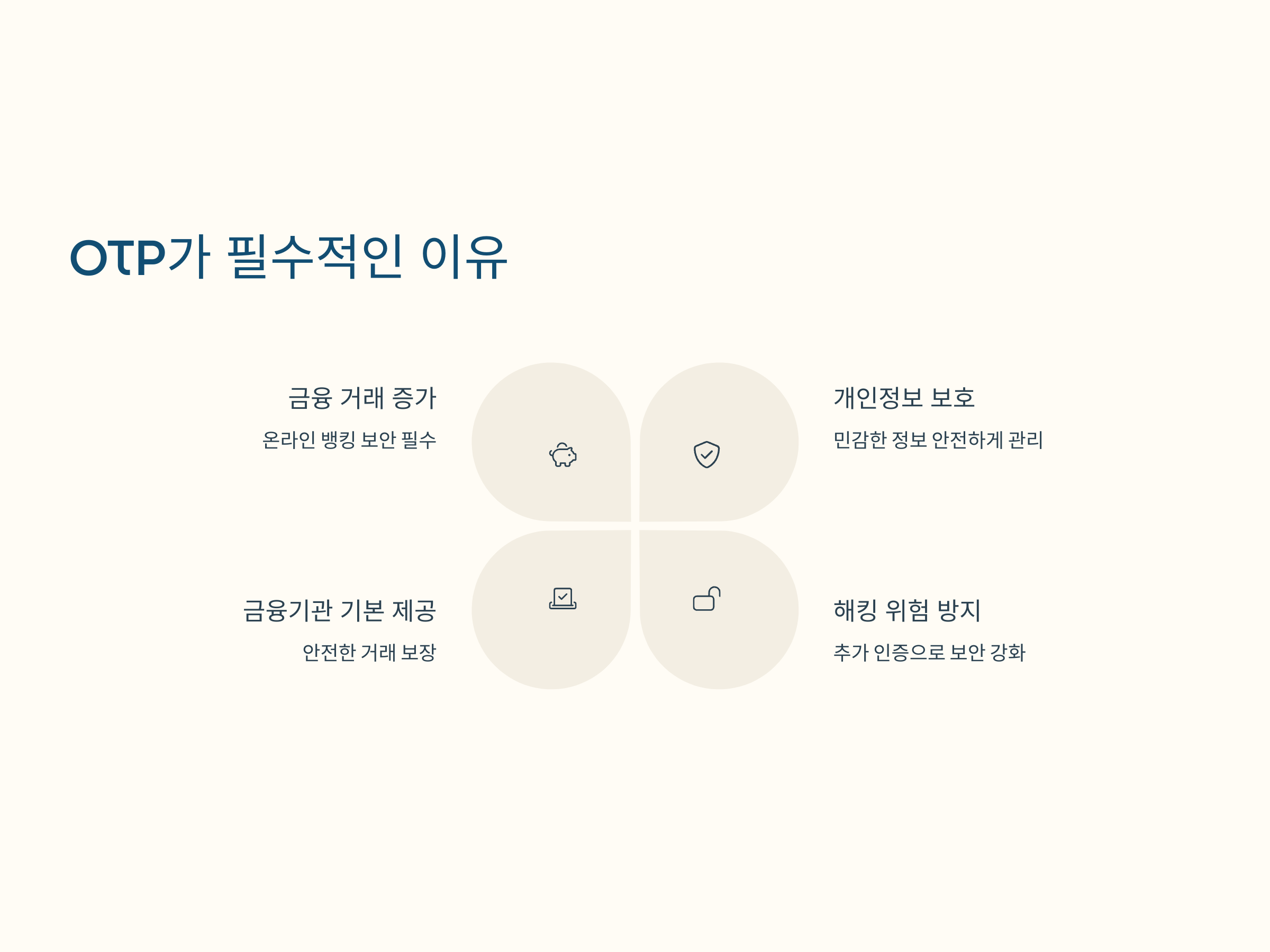 OTP는 비밀번호 외에도 추가적인 보안 레벨을 제공하므로, 온라인 거래나 서비스 로그인 시 더 높은 수준의 인증이 가능합니다.