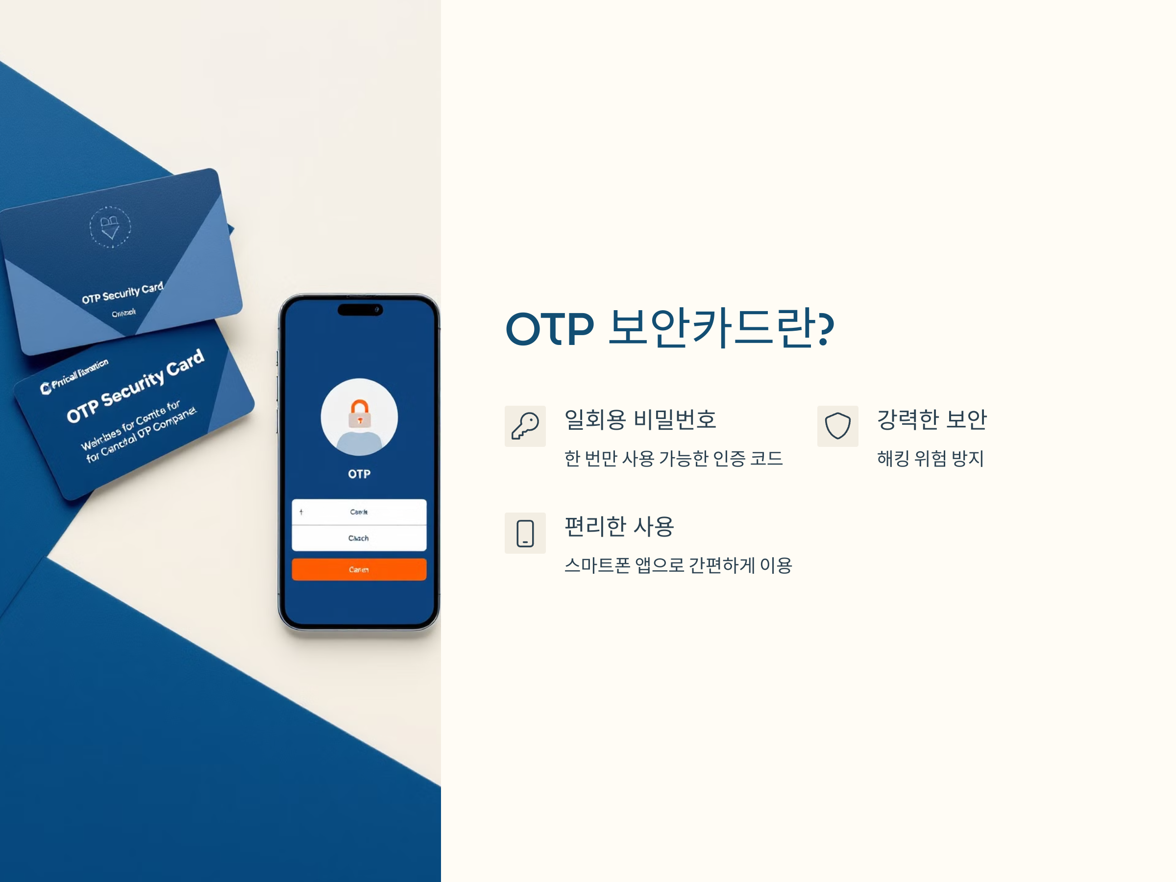 OTP 보안카드는 간편하면서도 강력한 보안을 제공합니다. 실제로 온라인 뱅킹에서 OTP 보안카드를 사용하면, 비밀번호만으로는 보호할 수 없는 해킹 위험을 방지할 수 있습니다.