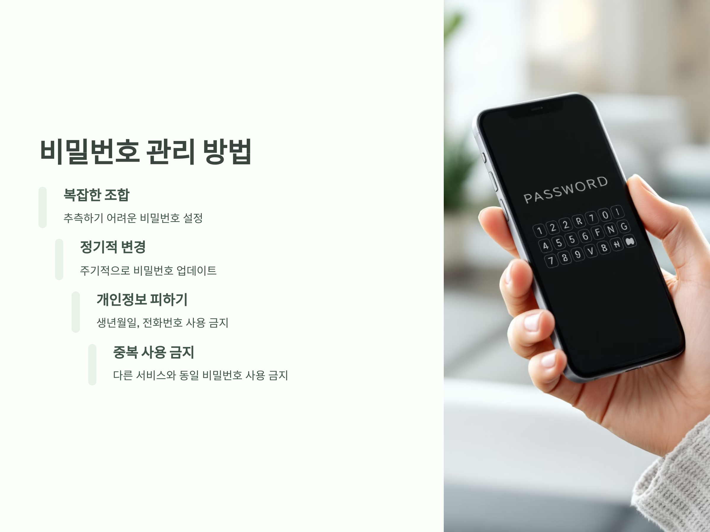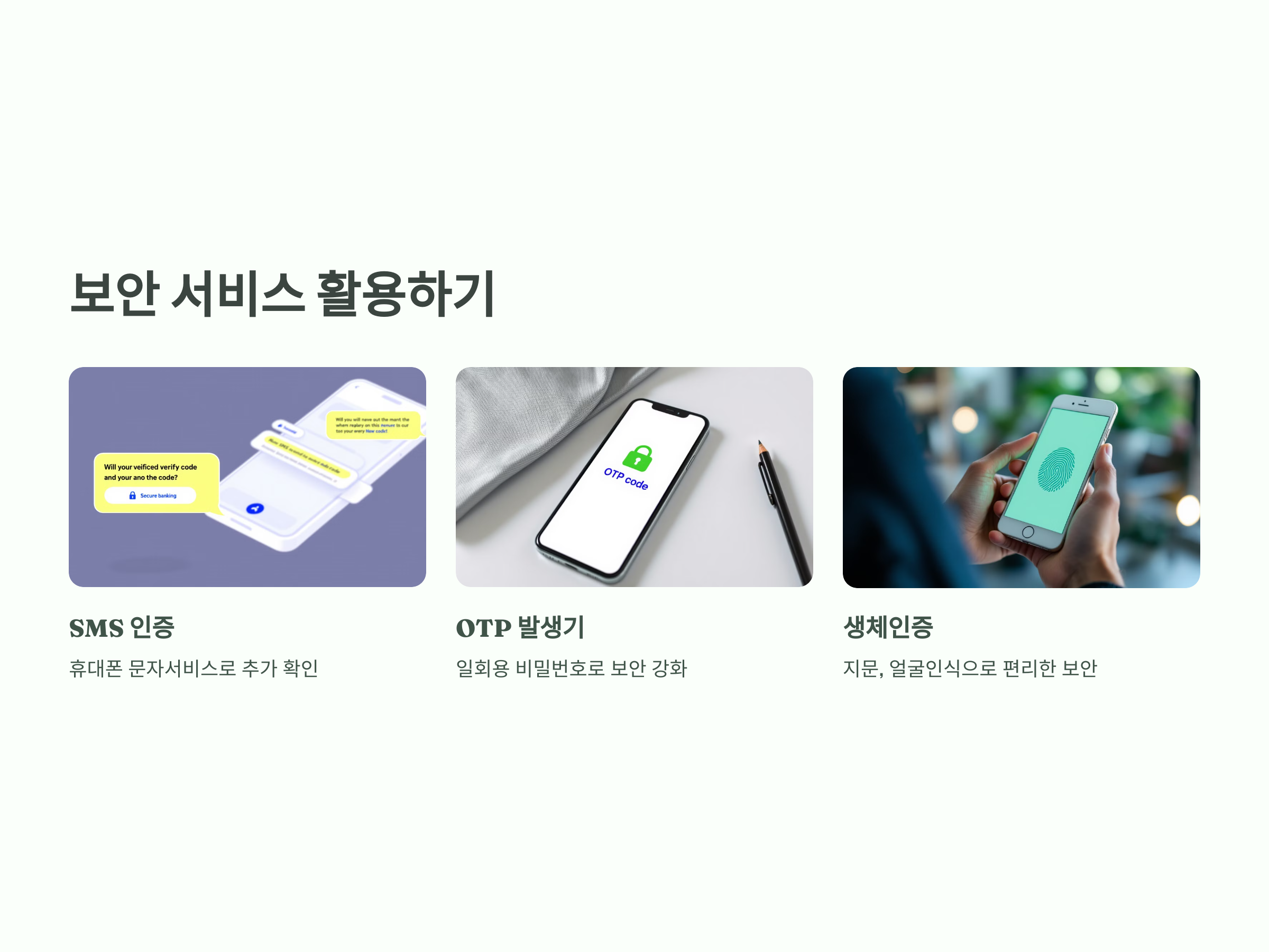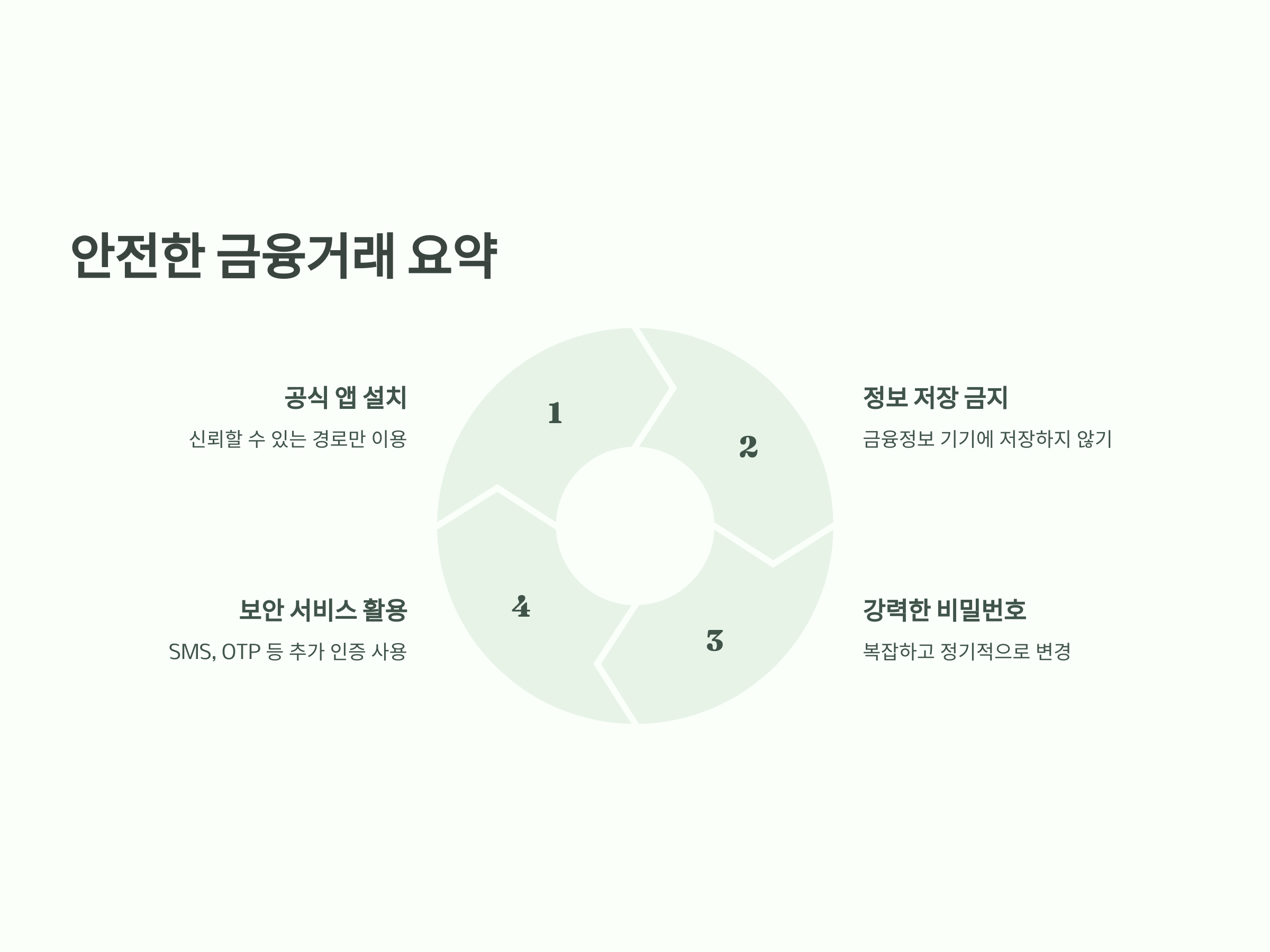 휴대폰 문자서비스(SMS)나 일회용 비밀번호(OTP) 발생기 등 금융보안서비스를 적극 활용하세요. 이러한 추가 인증 수단은 금융거래의 안전성을 크게 향상시킵니다. citeturn0search0