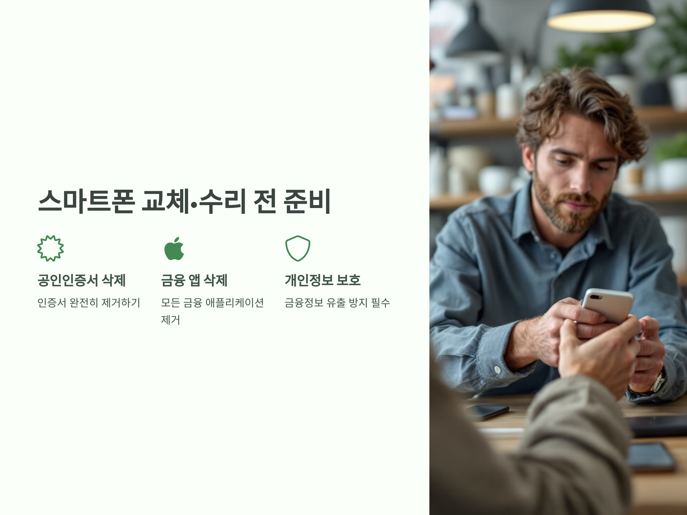 스마트폰을 교체하거나 수리하기 전에 공인인증서와 금융 애플리케이션을 삭제해야 합니다. 이는 개인 금융정보의 유출을 방지하기 위한 필수적인 조치입니다. citeturn0search0