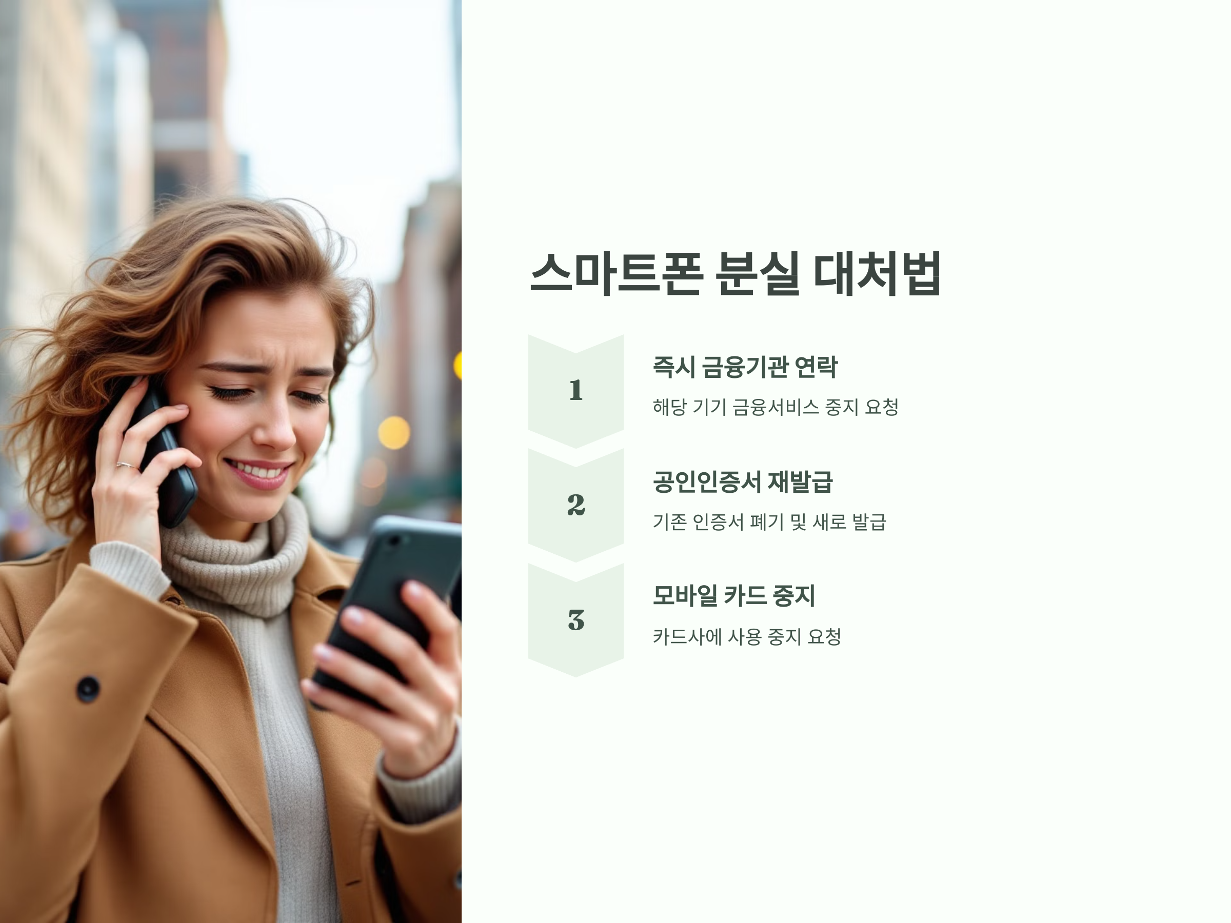 스마트폰을 분실하거나 도난당한 경우, 즉시 금융기관에 연락하여 해당 기기의 금융서비스를 중지하고, 공인인증서를 재발급 받아야 합니다. 또한, 모바일 신용카드를 사용 중이었다면 카드사에 연락하여 사용 중지를 요청해야 합니다. citeturn0search0