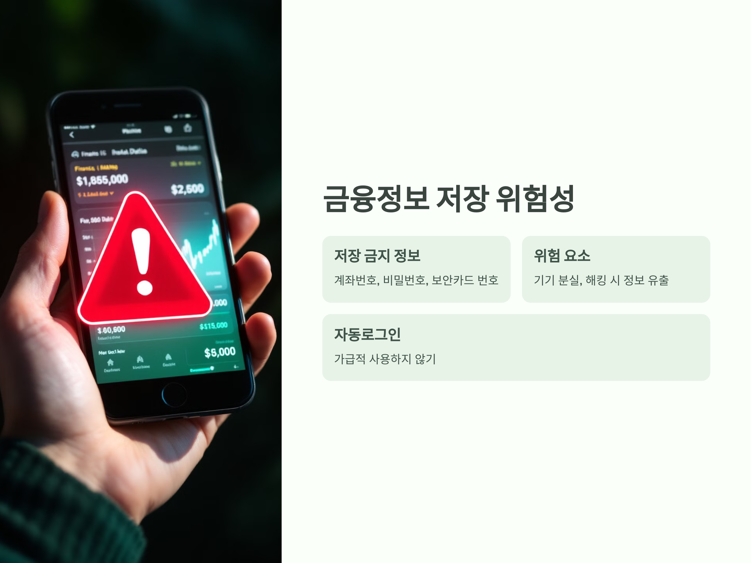 스마트폰이나 인터넷에 계좌번호, 비밀번호, 보안카드 번호 등 금융정보를 저장하는 것은 매우 위험합니다. 기기 분실이나 해킹 시 이러한 정보가 유출될 수 있으므로, 자동로그인 기능도 가급적 사용하지 않는 것이 좋습니다. citeturn0search0
