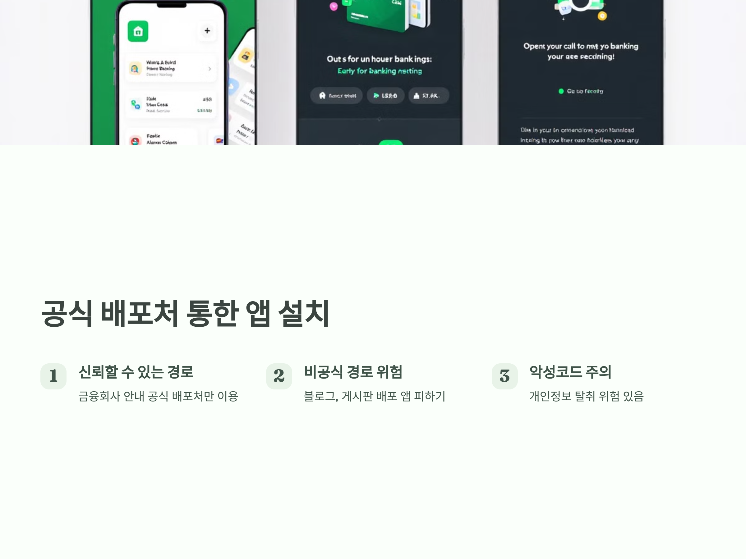 스마트폰 금융거래의 첫걸음은 신뢰할 수 있는 경로를 통해 금융 애플리케이션을 설치하는 것입니다. 금융회사가 안내하는 공식 배포처를 통해 앱을 설치해야 하며, 블로그나 게시판 등 비공식 경로로 배포되는 앱은 설치를 피해야 합니다. 이러한 앱은 악성코드를 포함하고 있을 수 있어 개인 정보를 탈취당할 위험이 있습니다. citeturn0search0