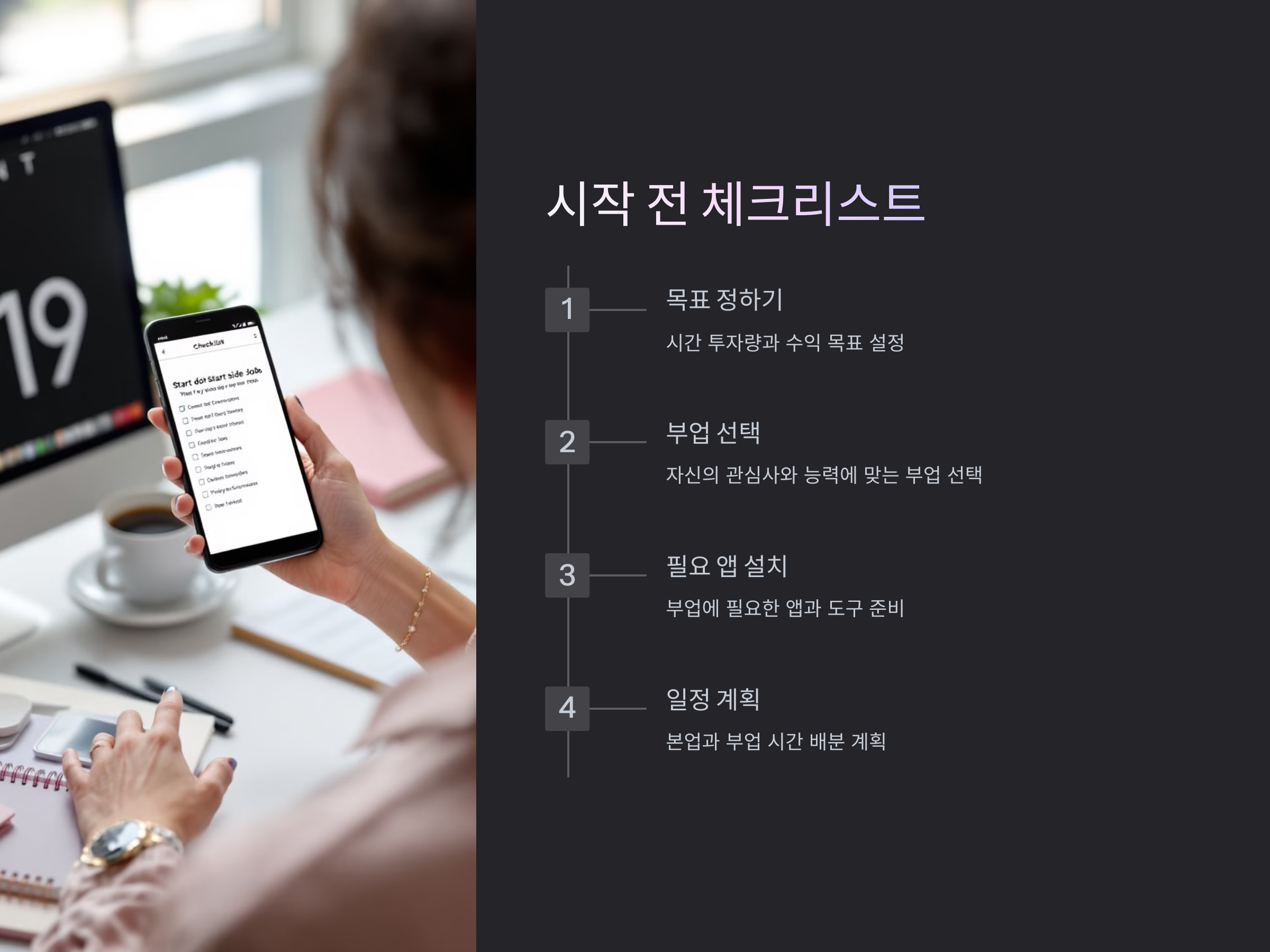 부업을 시작하기 전에 몇 가지 체크리스트를 확인해보세요. 이를 통해 스마트폰 부업을 더 효율적으로 시작할 수 있습니다.