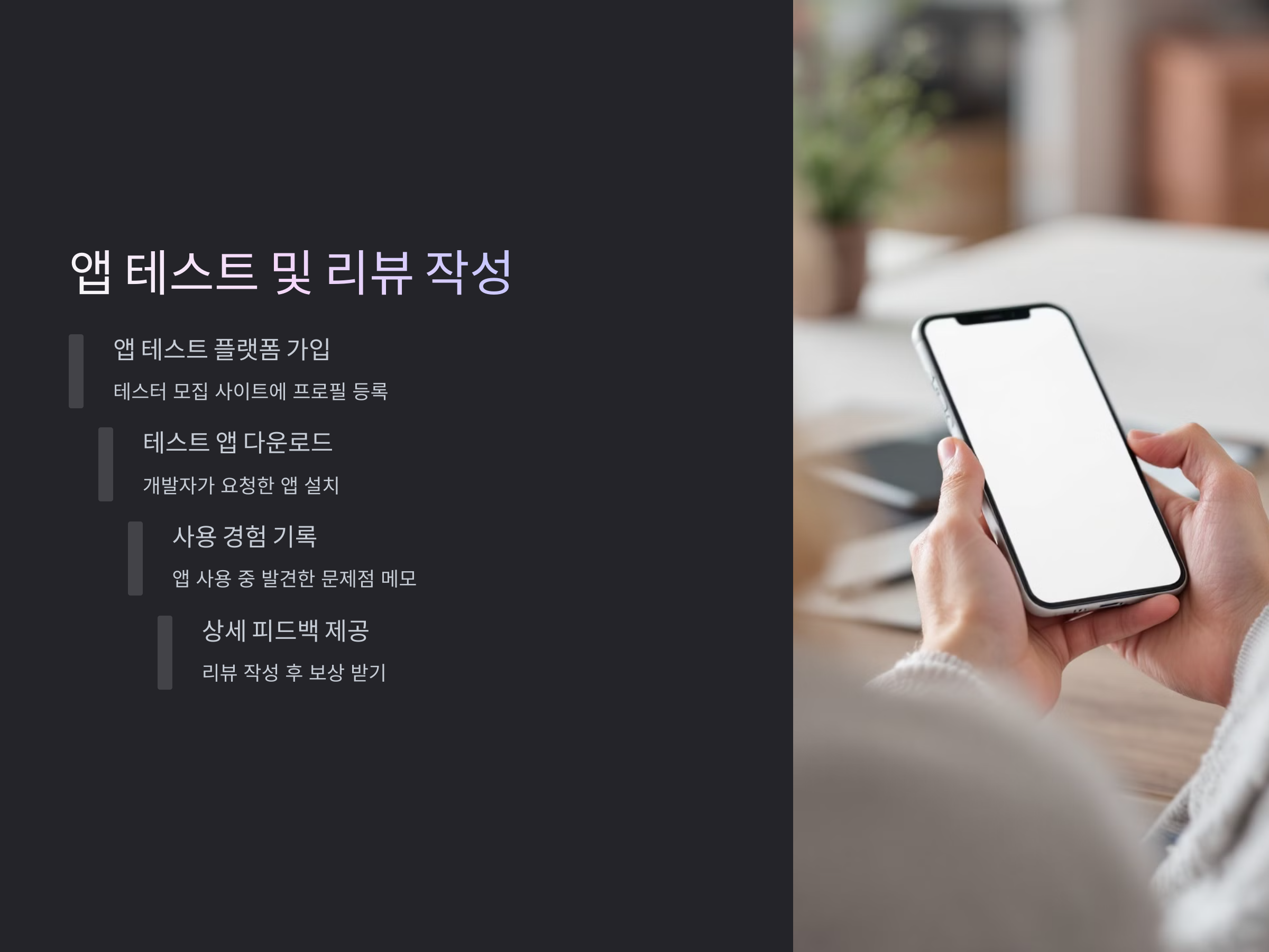 앱 테스트 및 리뷰 작성은 스마트폰을 이용한 부업 중에서도 유망한 방법입니다. 앱 개발자들은 새로운 앱을 출시할 때 사용자의 피드백을 받기 위해 앱 테스트를 진행합니다. 이 과정에서 참여자들에게 보상을 지급하며, 리뷰를 작성하거나 앱을 사용해 보며 피드백을 제공하는 방식입니다. 주로 앱 개발사들이 요구하는 테스트를 마친 후 일정 금액을 보상으로 지급하는 방식입니다.
