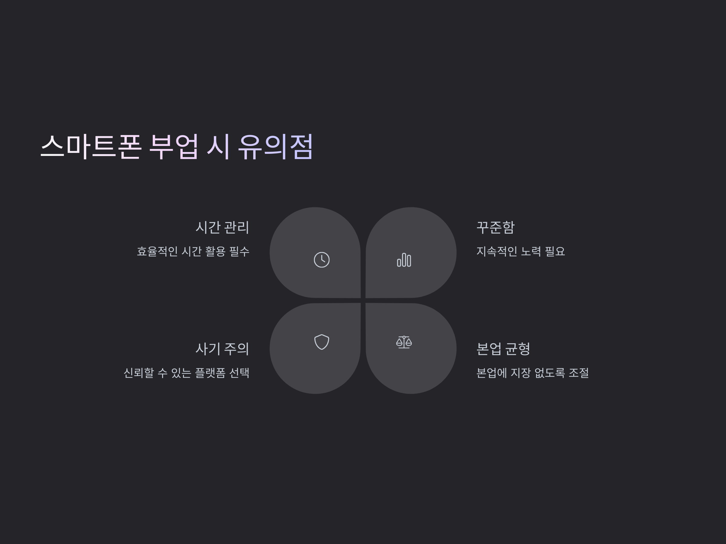스마트폰을 활용한 부업은 그만큼 유혹이 많습니다. 예를 들어, 소셜 미디어나 게임 등 다른 앱에서 시간을 낭비할 수 있기 때문에 시간 관리를 잘해야 합니다. 효율적인 시간을 관리하고, 부업을 위한 일정 시간을 확실히 정해두는 것이 중요합니다.