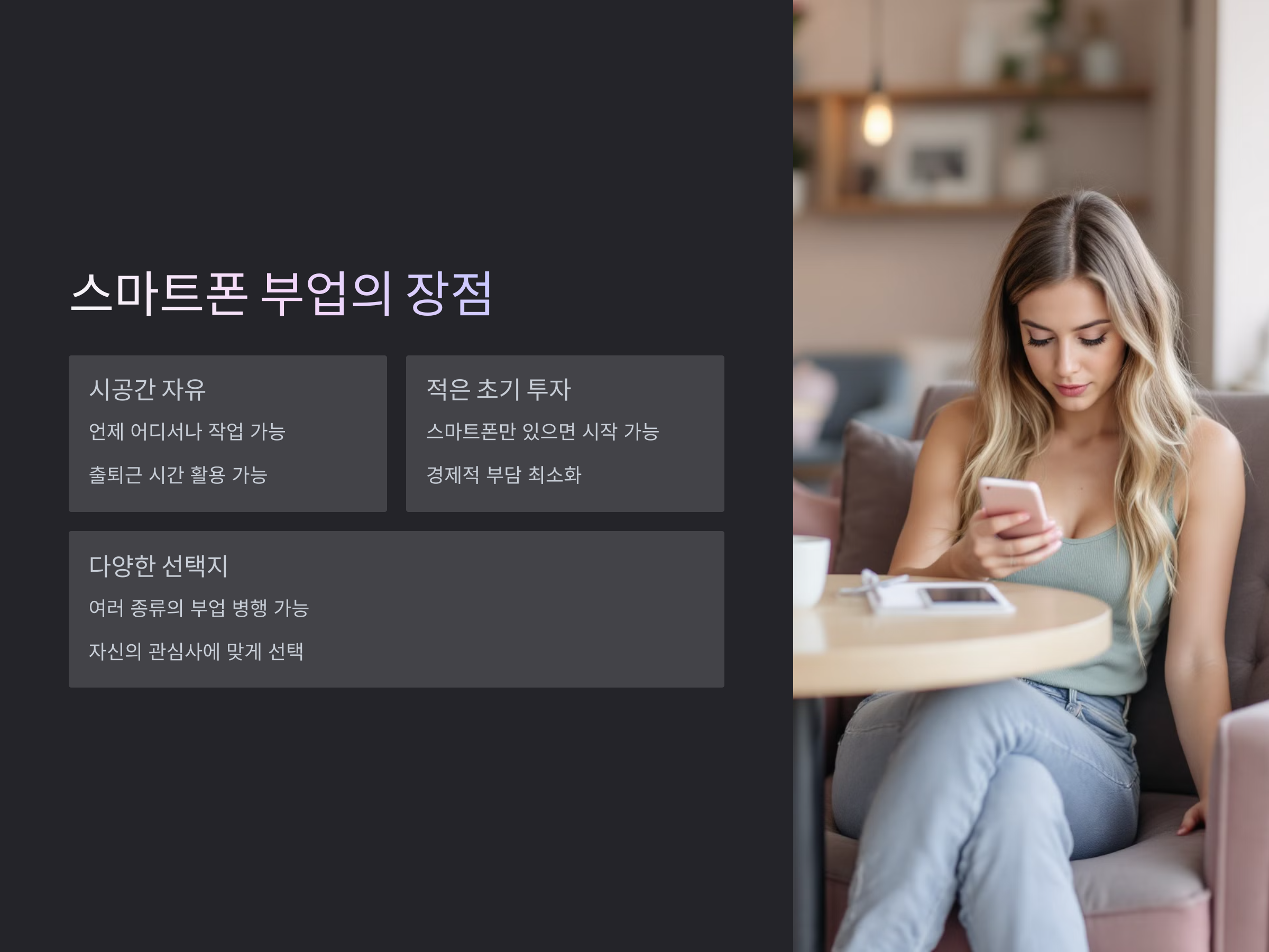 스마트폰을 이용한 부업의 가장 큰 장점은 바로 언제 어디서나 일을 할 수 있다는 점입니다. 출퇴근 시간이나 잠깐의 여유시간을 활용해서 부업을 진행할 수 있기 때문에, 본업과 병행하기 매우 유리합니다. 전통적인 오프라인 부업과 달리 장소에 구애받지 않고 스마트폰만 있으면 언제든지 작업을 할 수 있습니다.