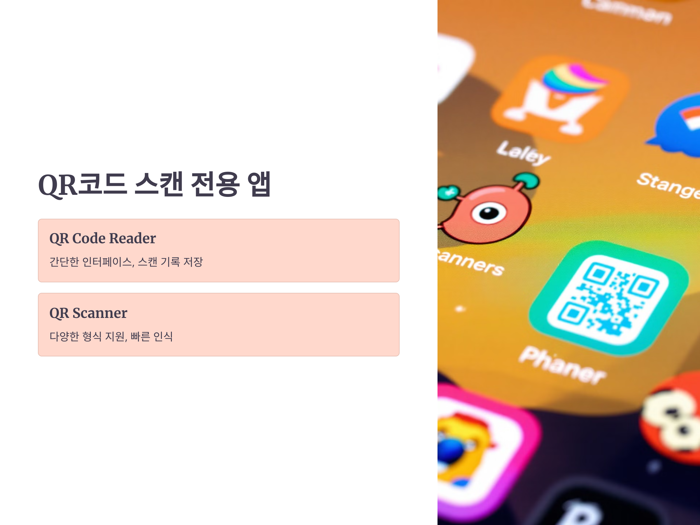 대부분의 최신 스마트폰은 기본 카메라 앱만으로 QR코드를 인식할 수 있습니다. 하지만 카메라 앱이 QR코드를 지원하지 않는 경우, 무료로 제공되는 다양한 QR코드 스캔 앱을 설치하여 사용할 수 있습니다.