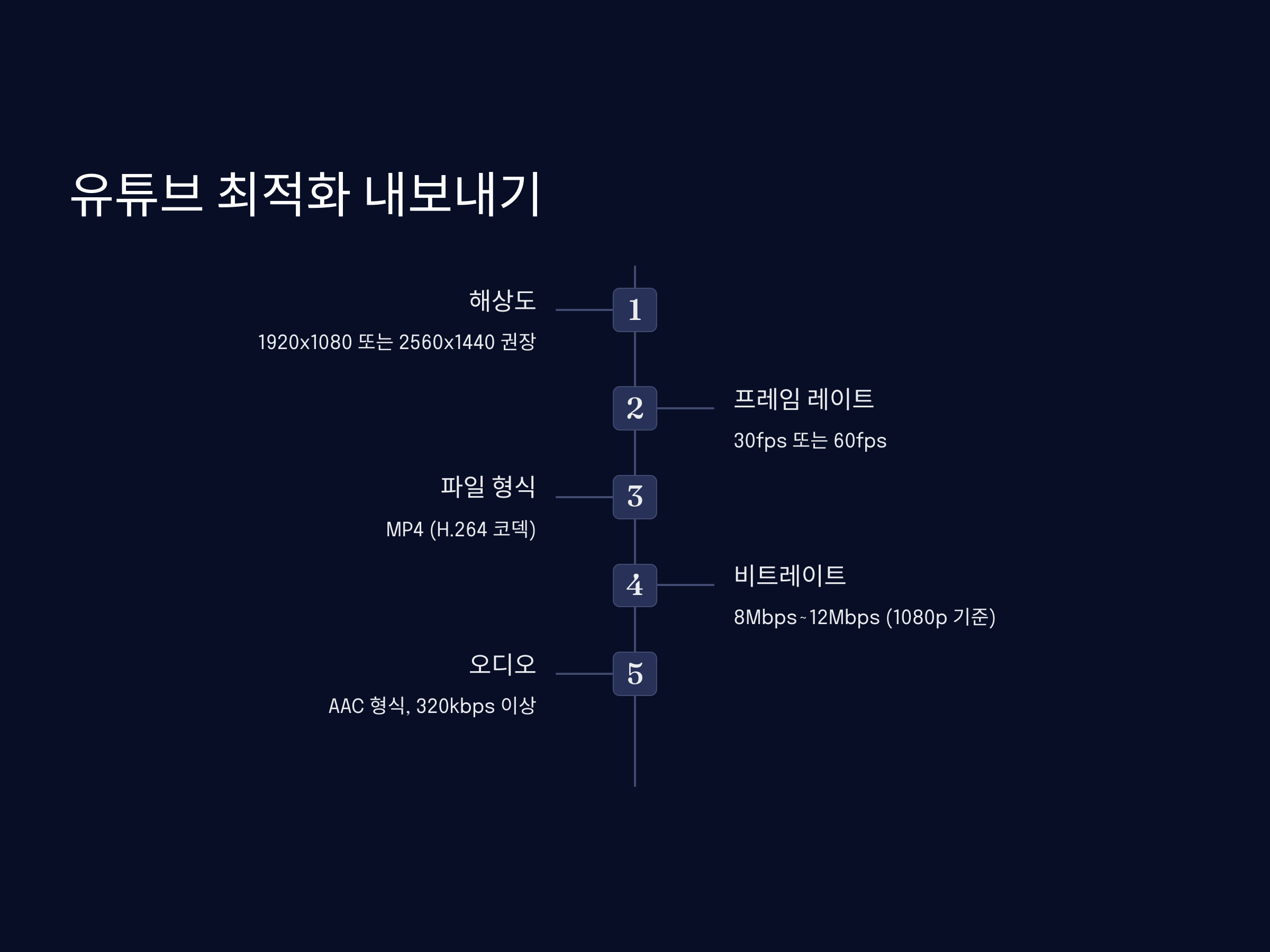 완성된 영상을 유튜브에 업로드하려면 올바른 내보내기 설정이 중요합니다. 유튜브 권장 설정을 따르면 고화질의 영상이 유지됩니다.