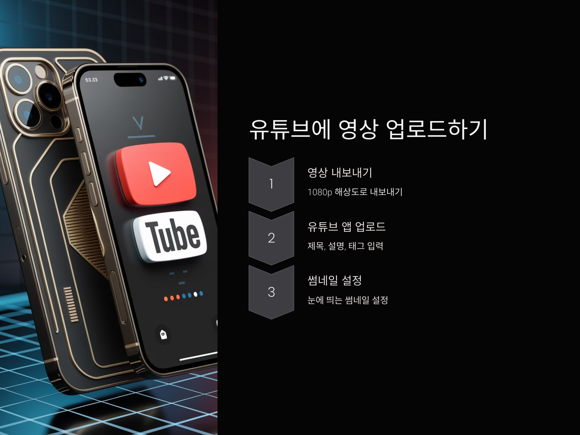 썸네일은 영상을 클릭할지 말지를 결정하는 중요한 요소입니다. 눈에 띄는 썸네일을 설정하는 것이 클릭률을 높이는 데 도움이 됩니다. 유튜브 앱에서 썸네일을 선택하거나, 스마트폰 편집 앱을 이용해 썸네일을 미리 만들어 두세요.