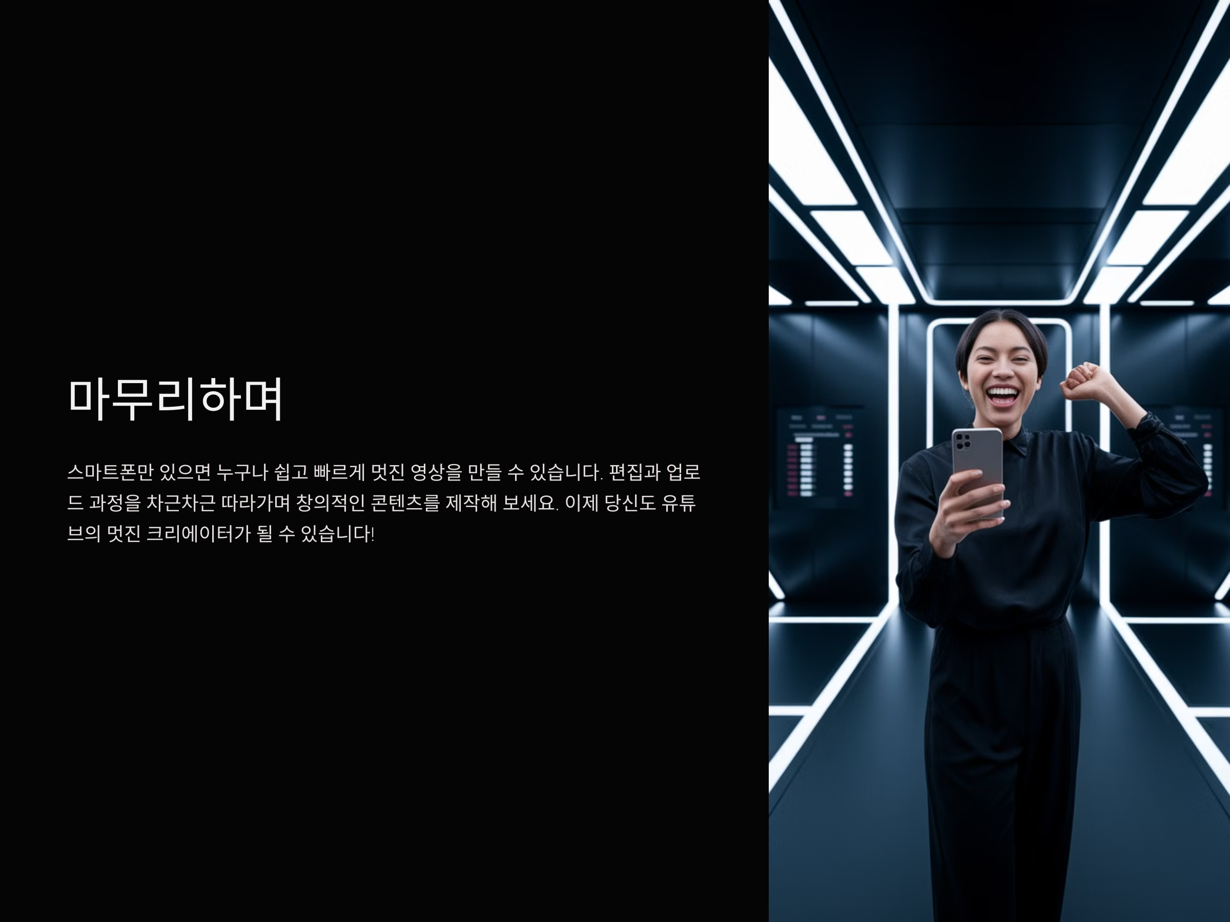 스마트폰만 있으면 누구나 쉽고 빠르게 멋진 영상을 만들 수 있습니다. 편집과 업로드 과정을 차근차근 따라가며 창의적인 콘텐츠를 제작해 보세요. 이제 당신도 유튜브의 멋진 크리에이터가 될 수 있습니다!