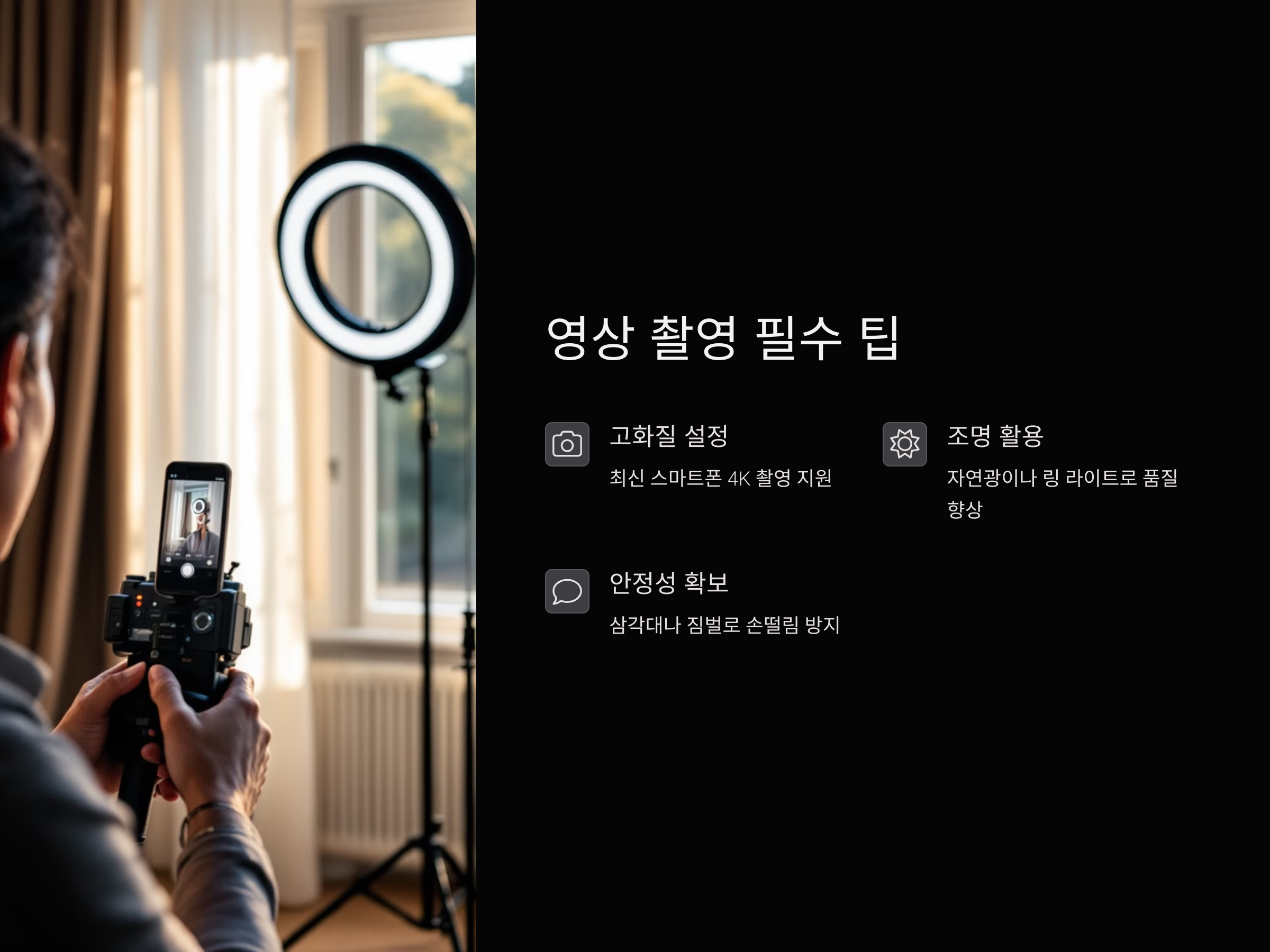 - 안정성: 스마트폰을 들고 촬영할 때 손떨림을 줄이는 것이 중요합니다. 삼각대나 짐벌을 활용하면 영상이 더 부드럽고 안정적입니다.
