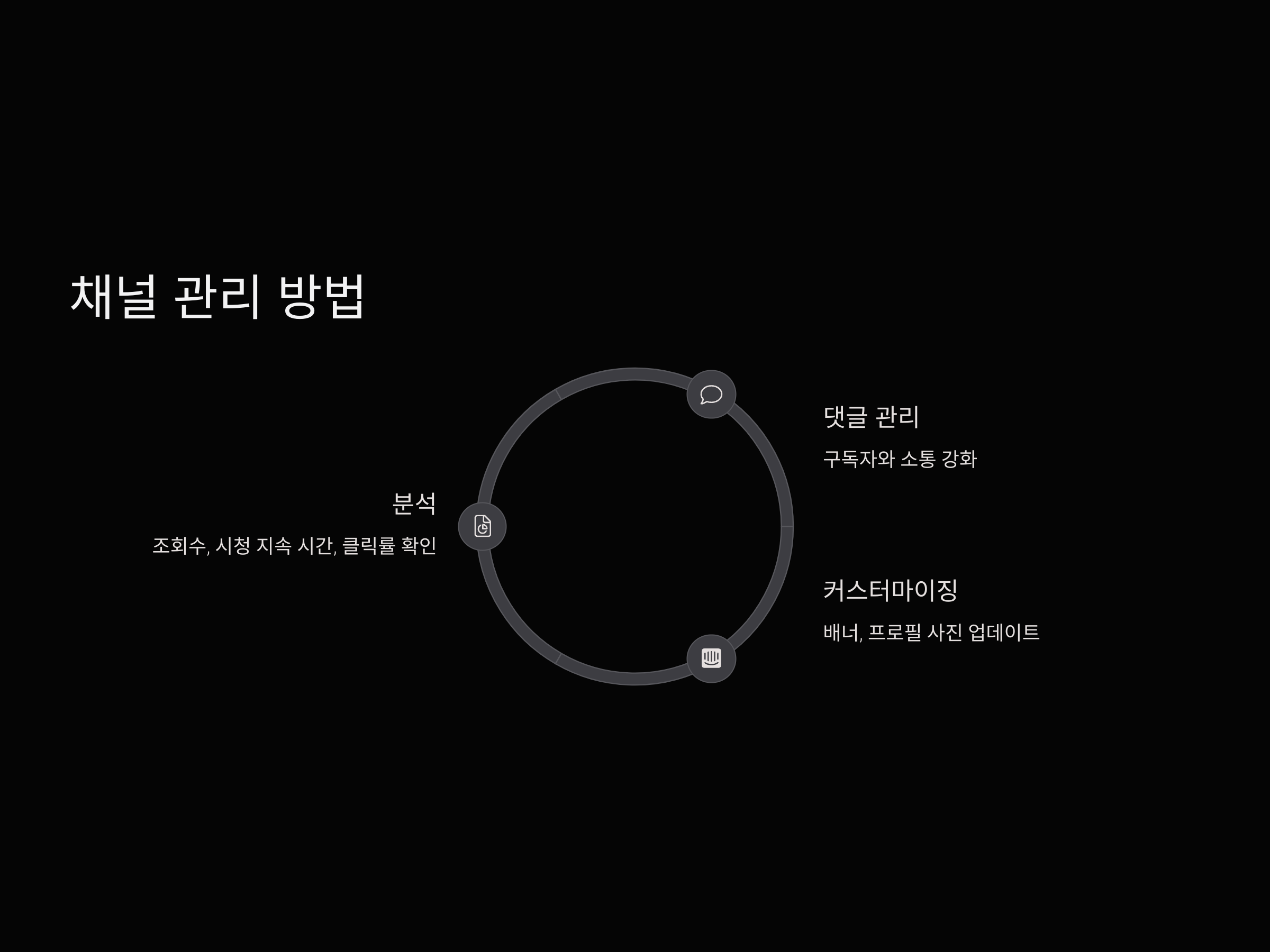 - 분석: 유튜브 스튜디오에서 제공하는 분석 데이터를 통해 영상의 조회수, 시청 지속 시간, 클릭률(CTR) 등을 확인할 수 있습니다.