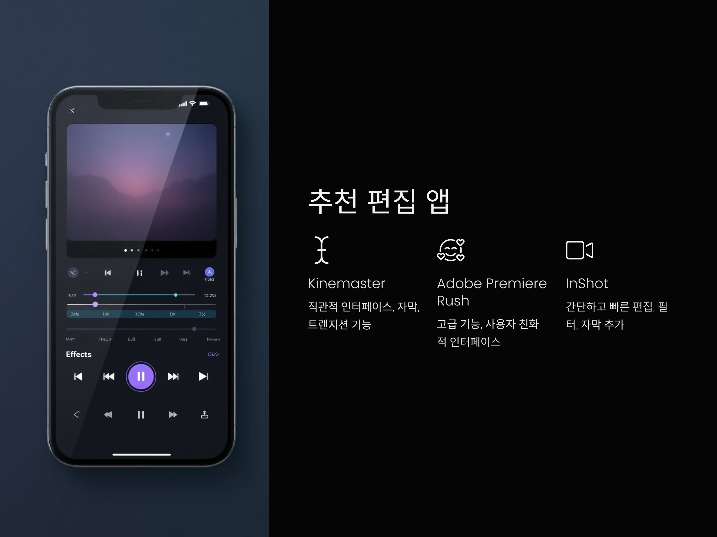 - Kinemaster: 직관적인 인터페이스와 다양한 기능을 제공하는 편집 앱입니다. 자막, 트랜지션, 음악 추가 등 모든 편집 작업을 스마트폰에서 간편하게 할 수 있습니다.