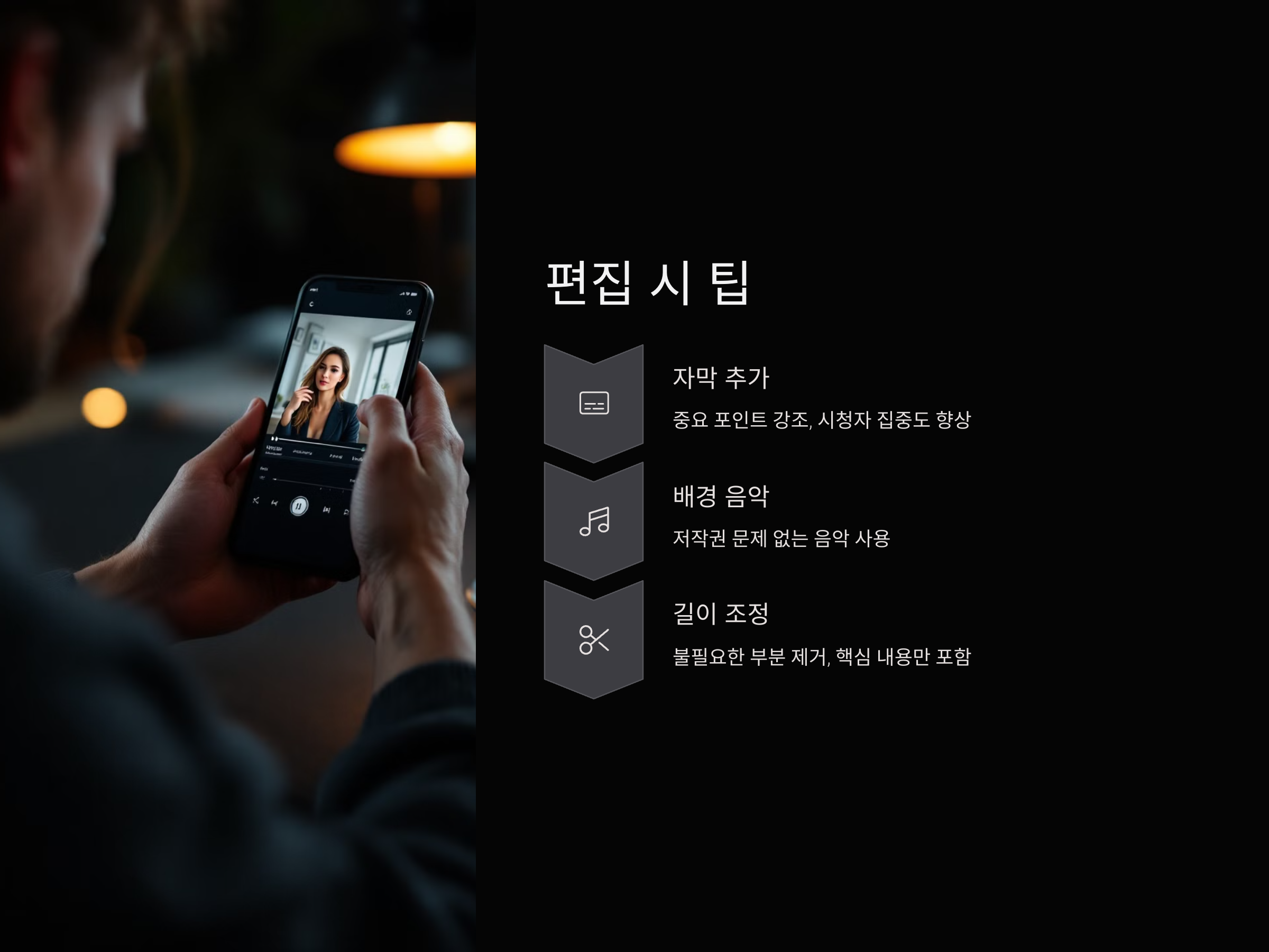 - 자막 추가: 중요한 포인트나 메시지를 강조하고 싶다면 자막을 추가하는 것이 좋습니다. 자막은 특히 시청자의 집중도를 높여줍니다.
