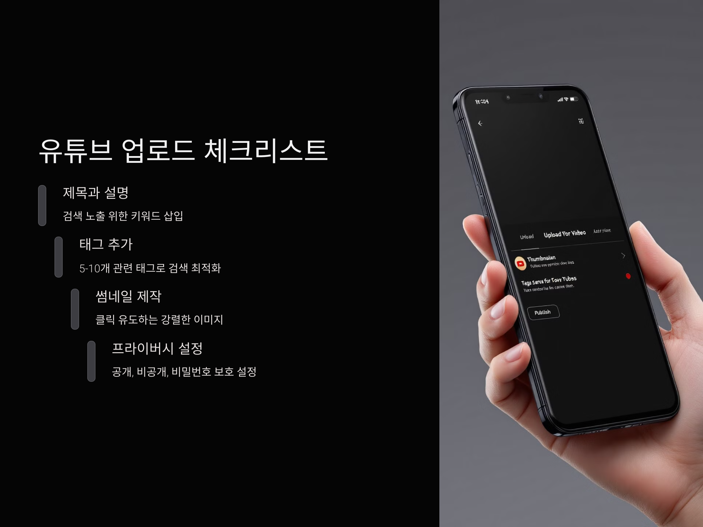 - 제목과 설명: 검색에 잘 노출되도록 적절한 키워드를 제목과 설명에 삽입합니다. 제목은 짧고 강렬하게, 설명은 영상의 핵심을 잘 전달해야 합니다.