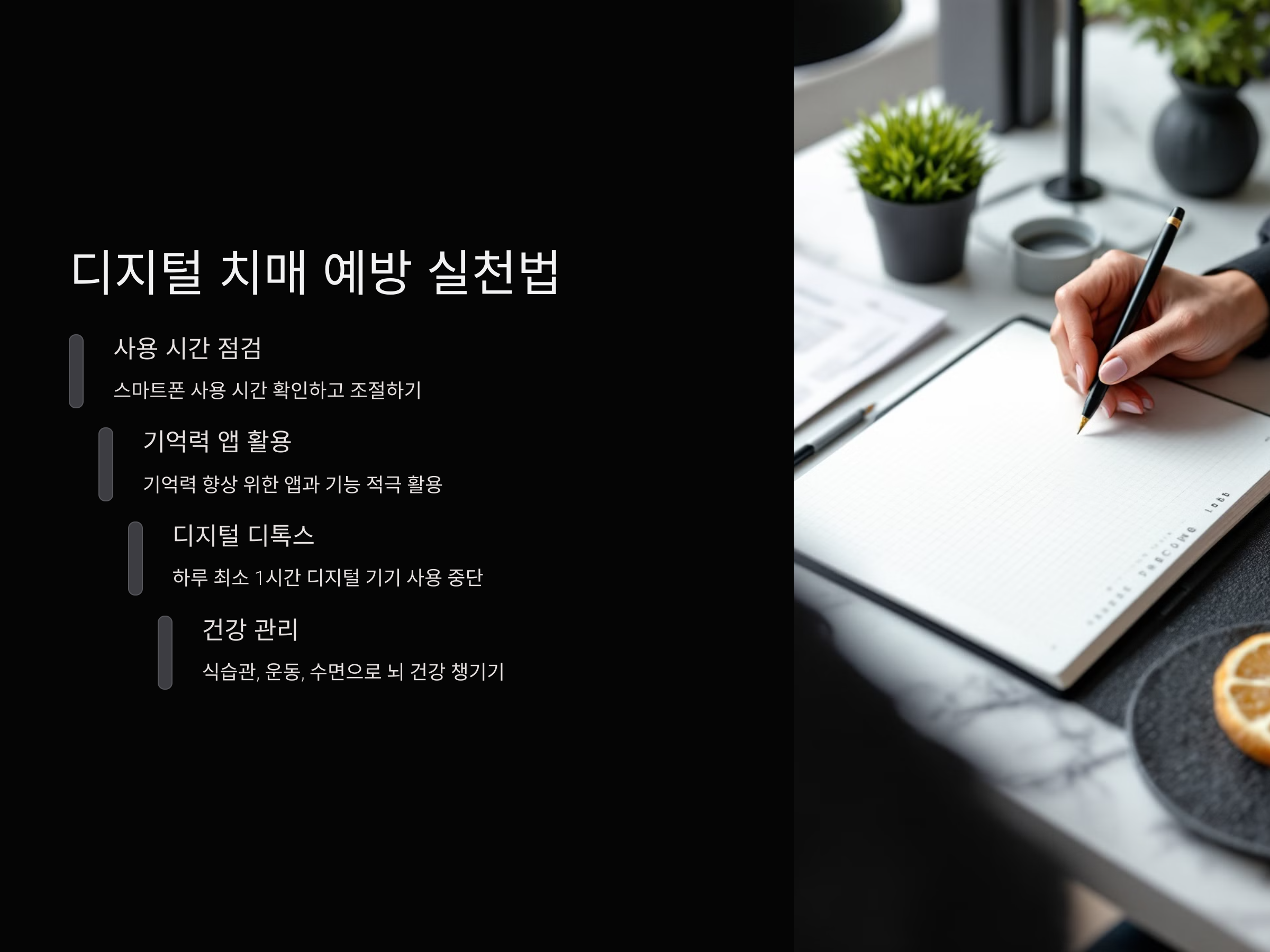 디지털 치매를 예방하기 위해서는 스마트폰을 무조건 멀리하는 것이 아니라, 올바르게 활용하는 것이 중요합니다. 아래 내용을 실천하면서 건강한 디지털 생활을 유지해 보세요.