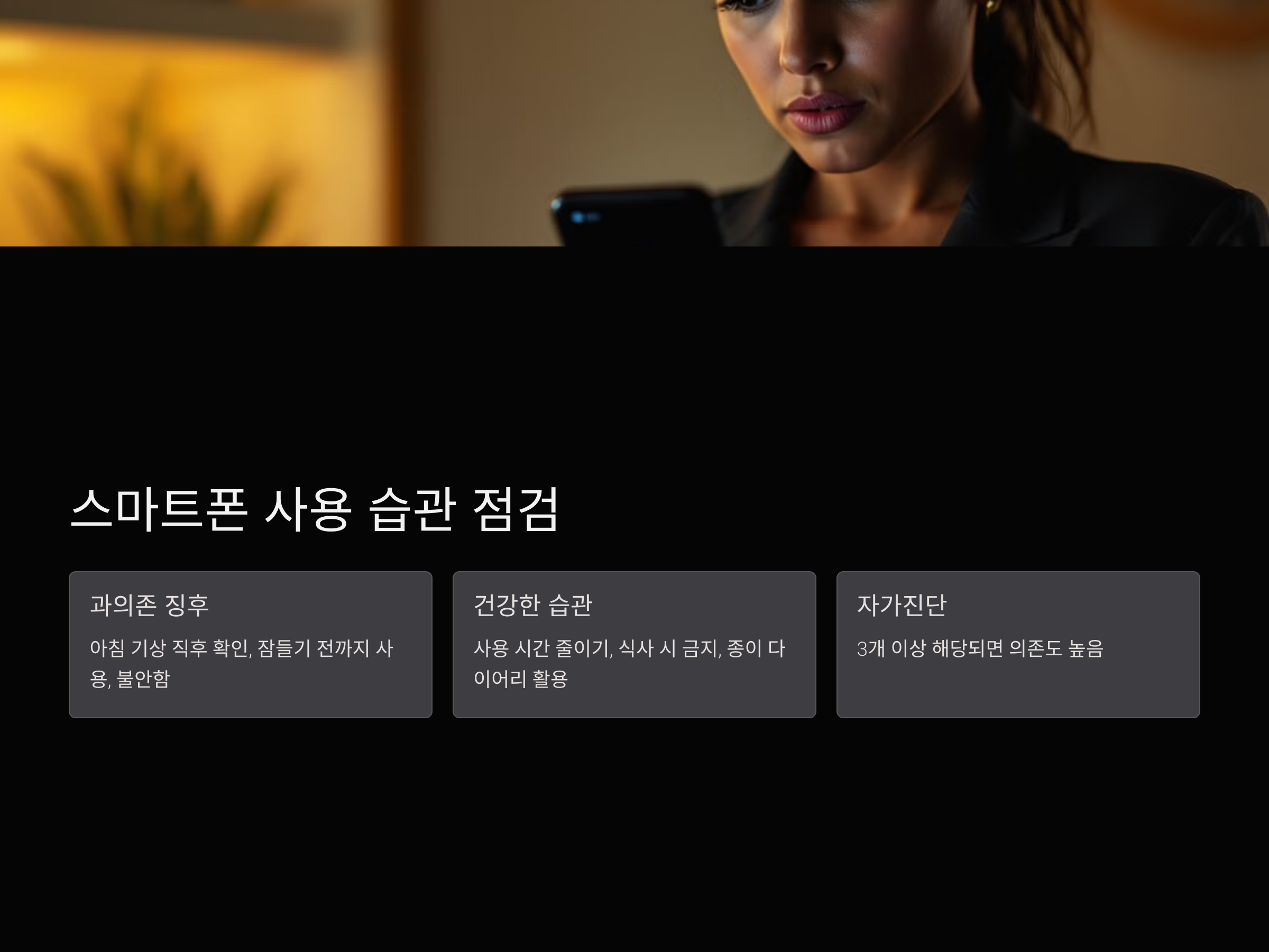 위 항목 중 3개 이상 해당된다면 스마트폰 의존도가 높은 상태이므로 사용 습관을 점검해야 합니다.