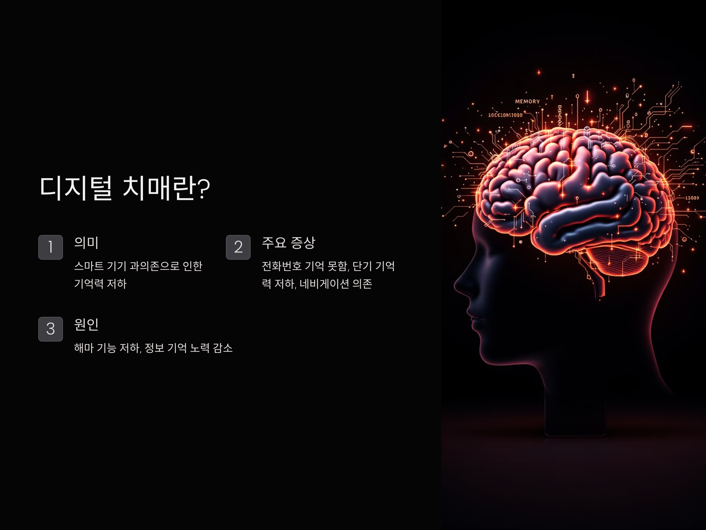 디지털 치매는 스마트폰, 태블릿, 컴퓨터 등의 전자 기기에 과도하게 의존할 때 나타나는 기억력 저하 현상을 뜻합니다. 일반적인 치매와는 다르게 뇌의 구조적 손상이 아닌 '기능적 문제'에서 비롯되며, 주로 젊은 층에서 많이 발생하는 것이 특징입니다.