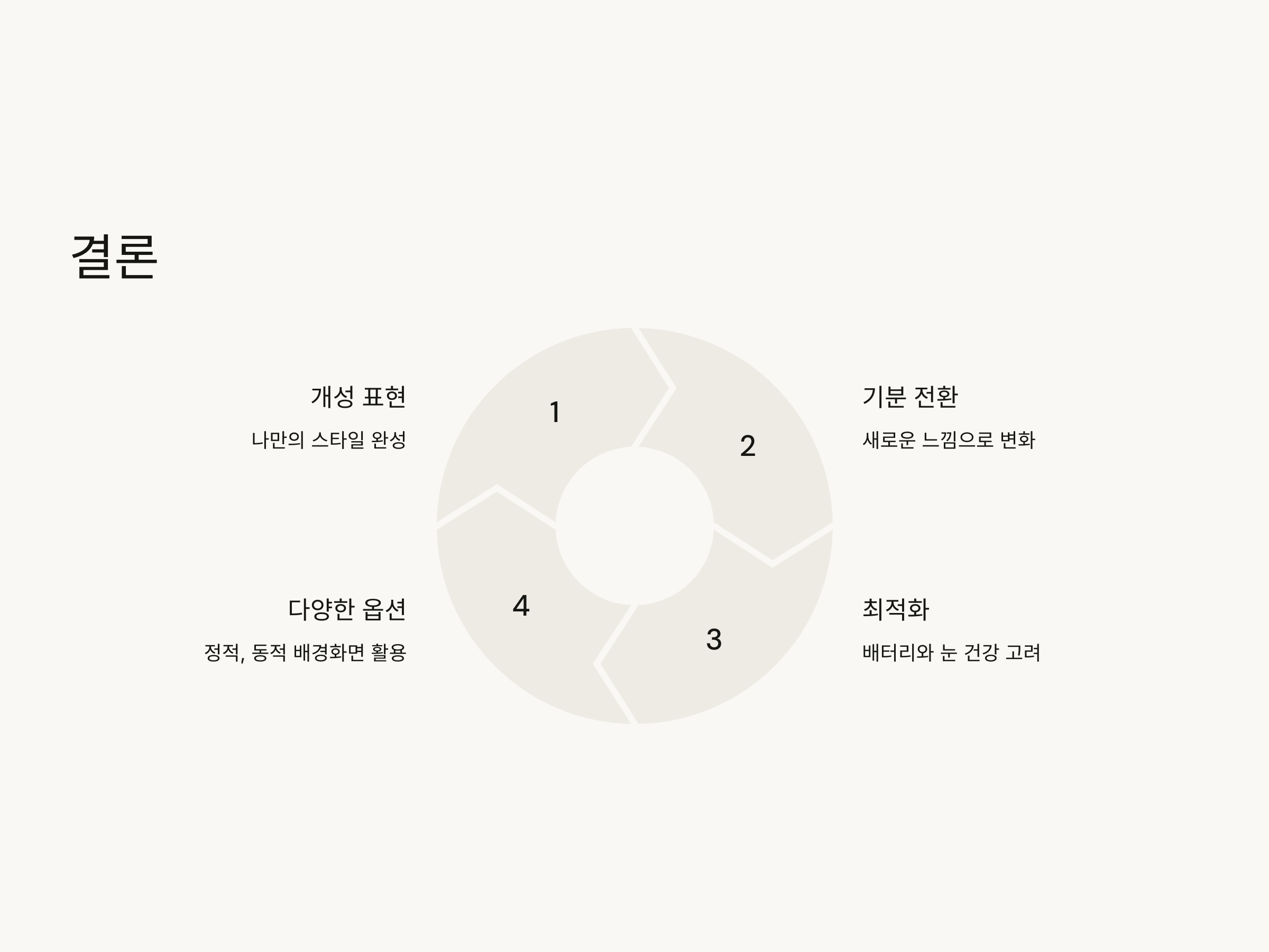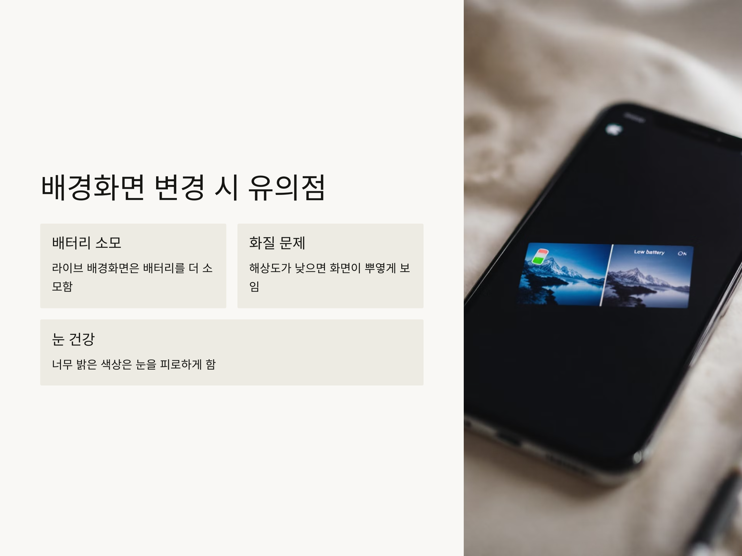 - 너무 밝거나 강한 색상의 배경화면은 눈을 피로하게 할 수 있음