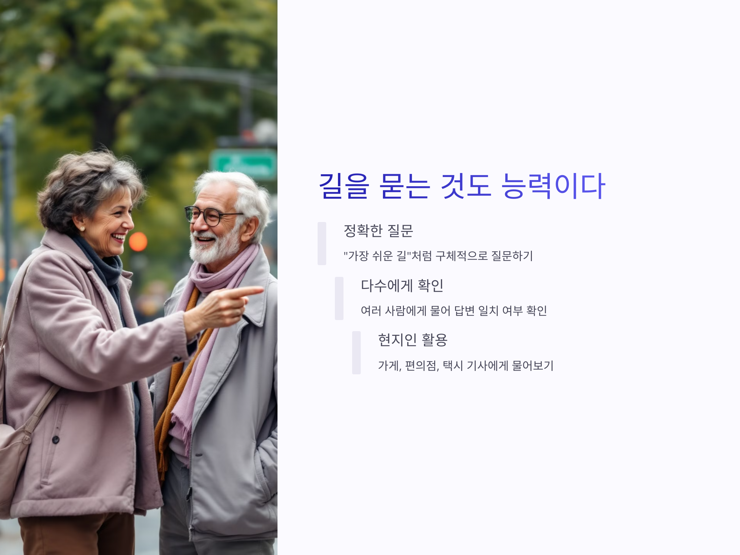 먼저, 정확한 질문을 던지는 것이 중요하다. “여기서 ○○역까지 어떻게 가나요?”보다는 “○○역까지 가는 가장 쉬운 길은 어디인가요?”라고 묻는 것이 좋다. 또한, 같은 질문을 여러 사람에게 물어보고 답변이 일치하는지 확인하면 신뢰도를 높일 수 있다.