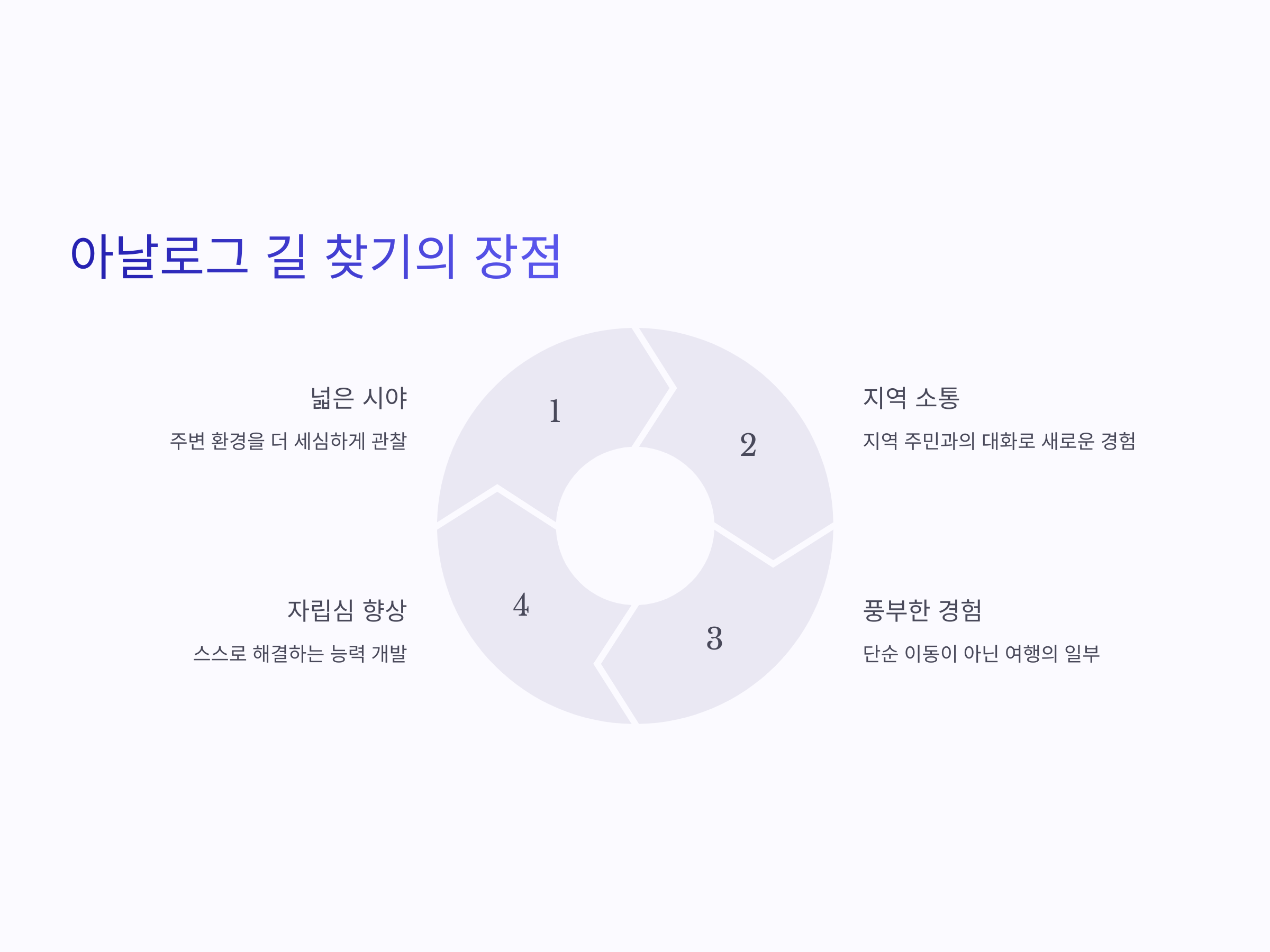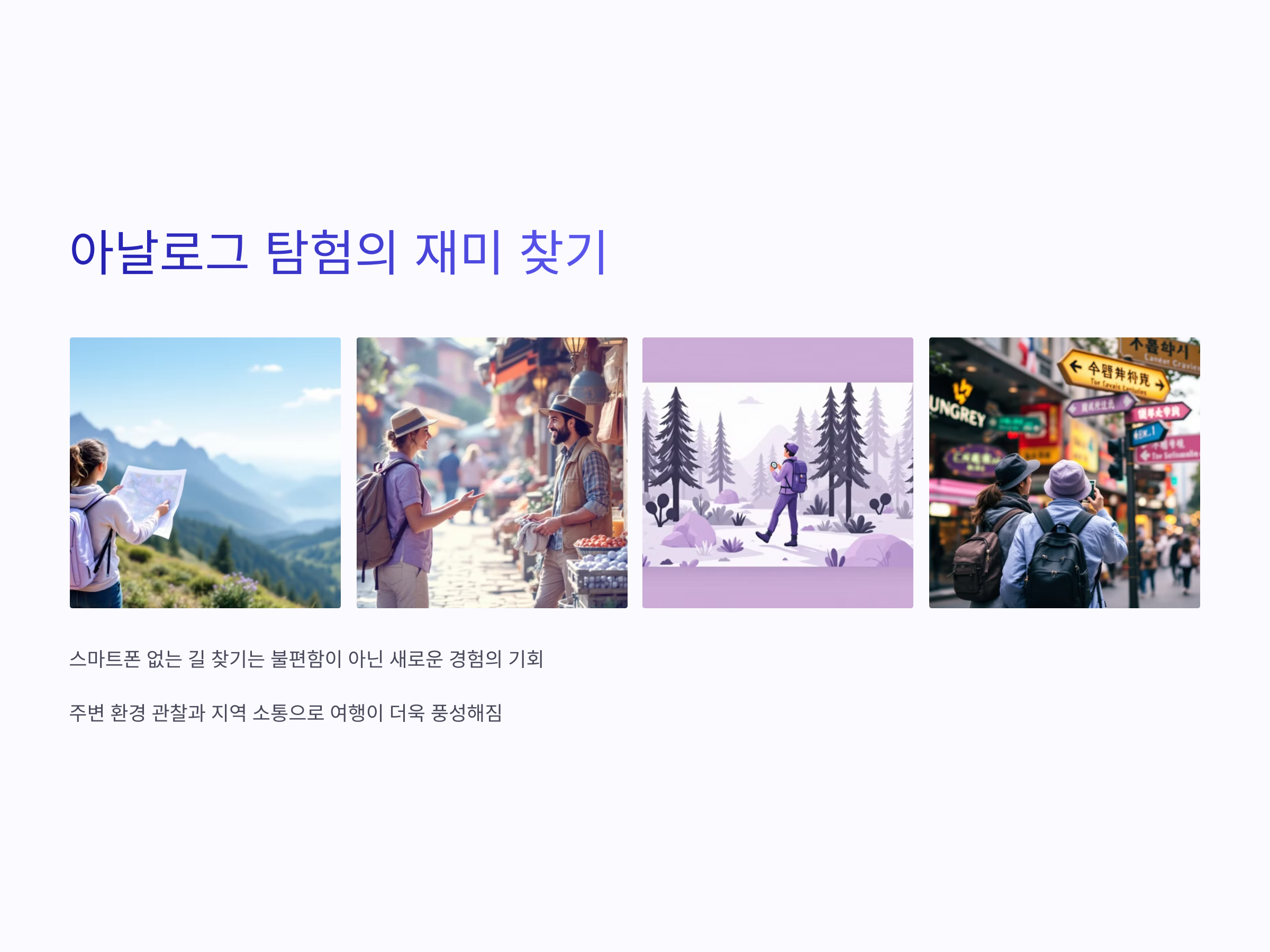 스마트폰 없이 길을 찾는 것은 단순히 불편함을 감수하는 것이 아니라, 더 넓은 시야와 새로운 경험을 얻는 과정이다. 아날로그 방식으로 길을 찾으면서 주변 환경을 더 세심하게 관찰할 수 있으며, 지역 주민과의 소통을 통해 뜻밖의 재미있는 경험을 하기도 한다. 길 찾기는 단순한 이동이 아니라, 여행을 더욱 풍성하게 만드는 요소