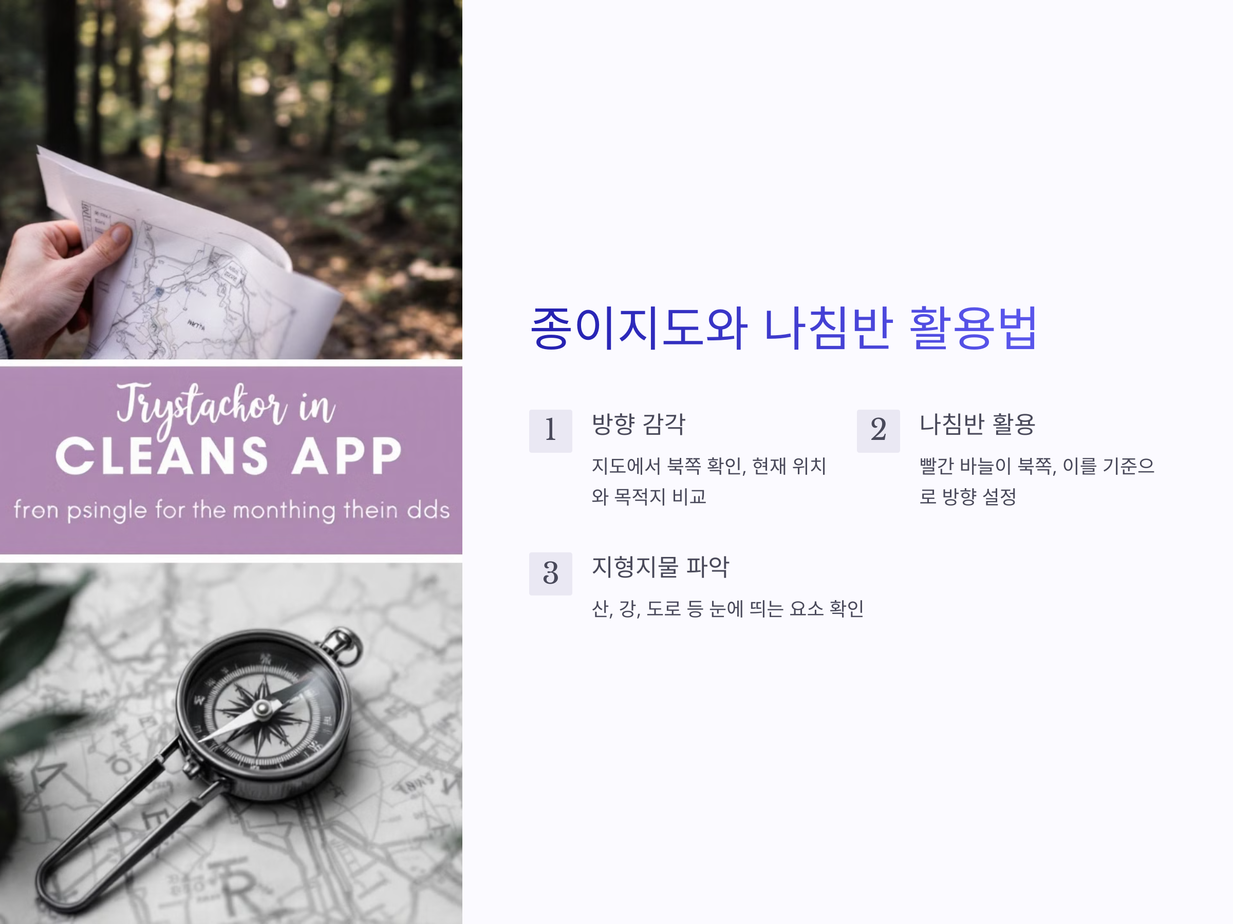 스마트폰 이전 시대에는 종이지도가 필수 아이템이었다. 지금도 등산이나 여행을 떠날 때, 혹은 인터넷 연결이 불안정한 지역에서는 종이지도가 유용하다. 지도의 기본적인 읽는 방법과 나침반 활용법을 익히면 스마트폰이 없어도 현재 위치와 목적지를 파악할 수 있다.