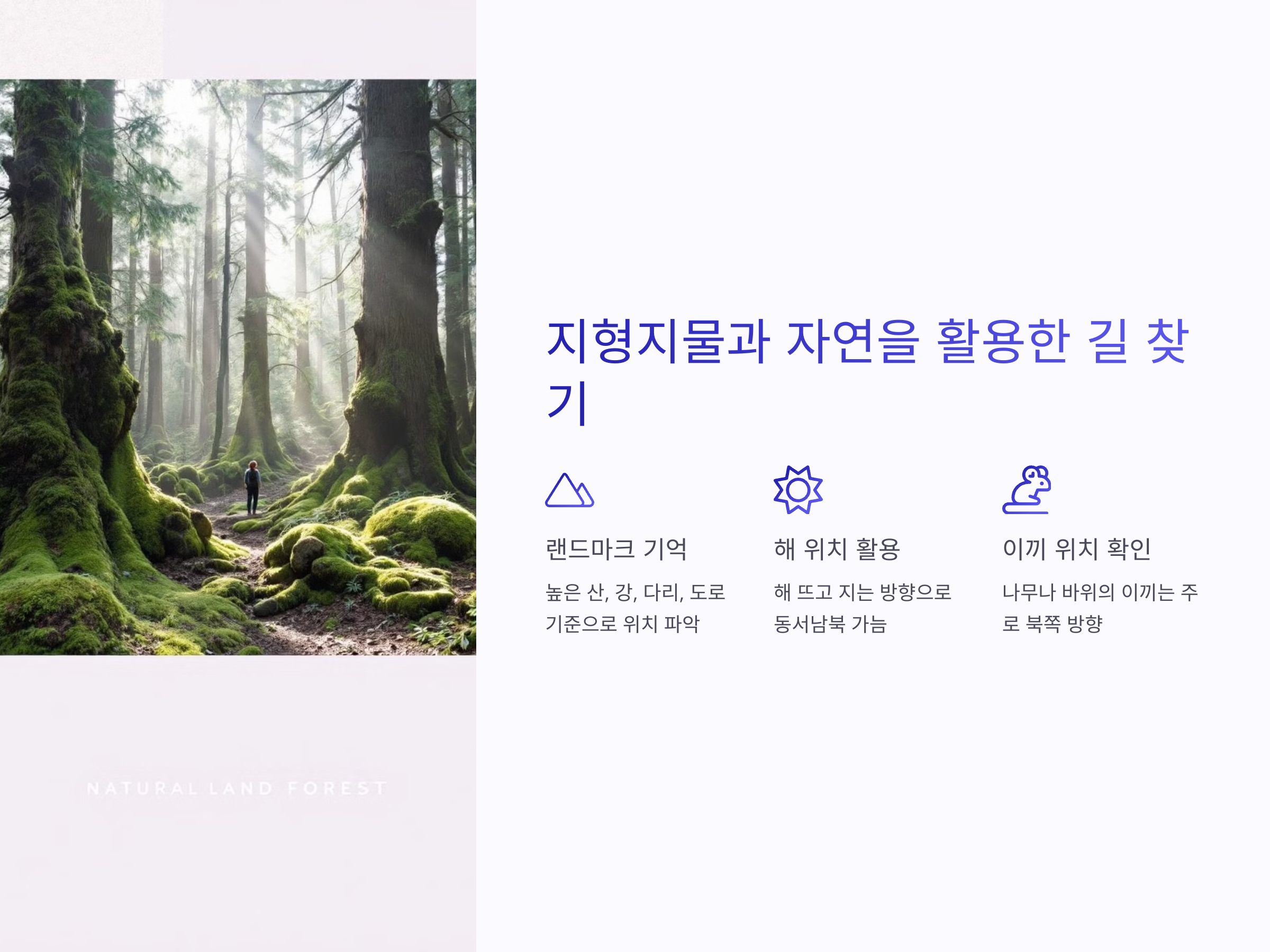 예를 들어, 높은 산, 강, 다리, 도로 등을 기준으로 현재 위치를 파악할 수 있다. 해가 뜨고 지는 방향을 이용하면 대략적인 동서남북을 가늠할 수도 있다. 또한, 이끼의 위치를 확인하는 방법도 있다. 나무나 바위에 자란 이끼는 일반적으로 북쪽을 향하는 경향이 있으므로, 이를 참고하면 방향을 정하는 데 도움이 된다.