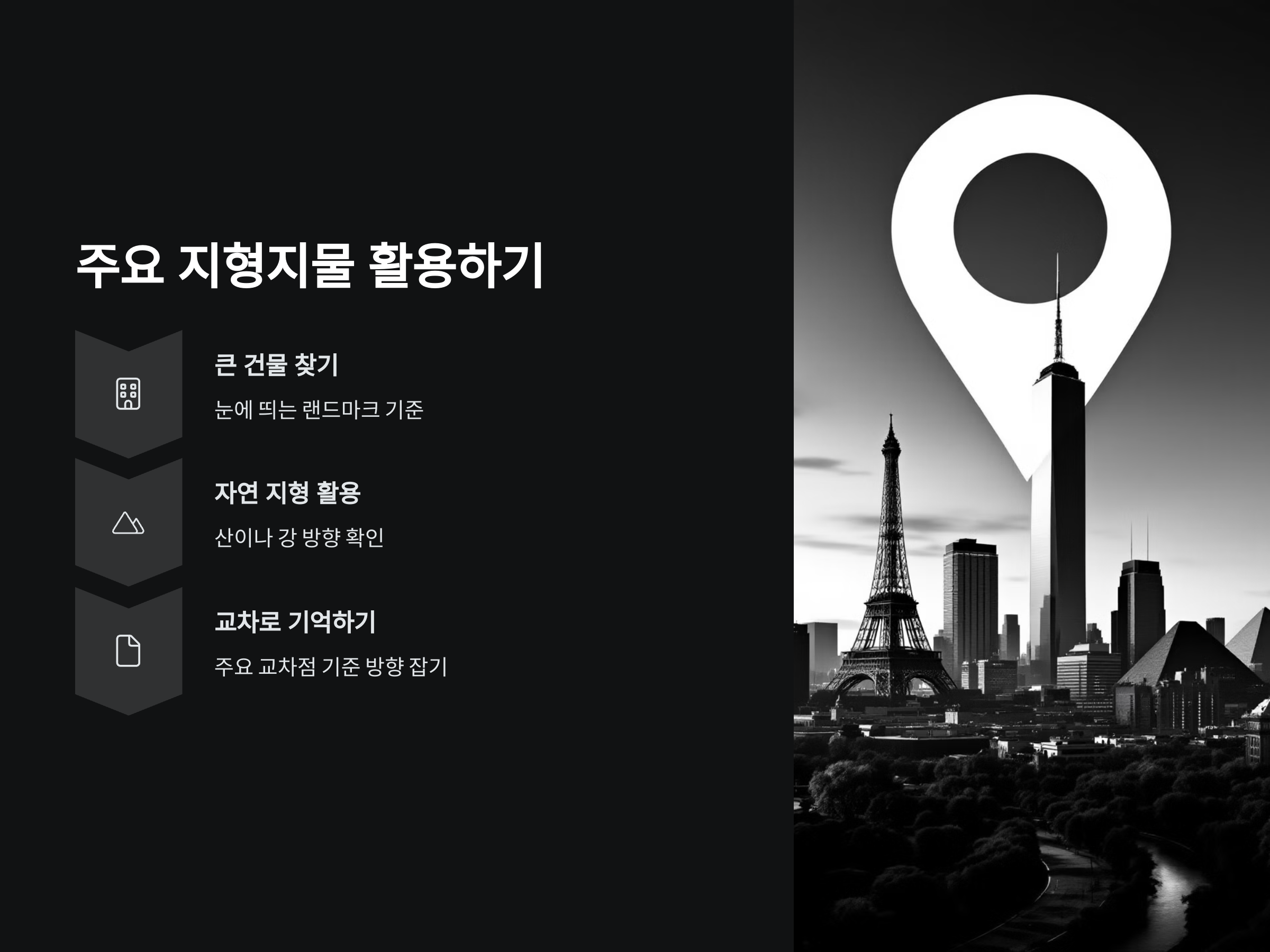 - 주변에 큰 건물이나 눈에 띄는 산, 교차로 등을 찾아서 방향을 유추합니다.