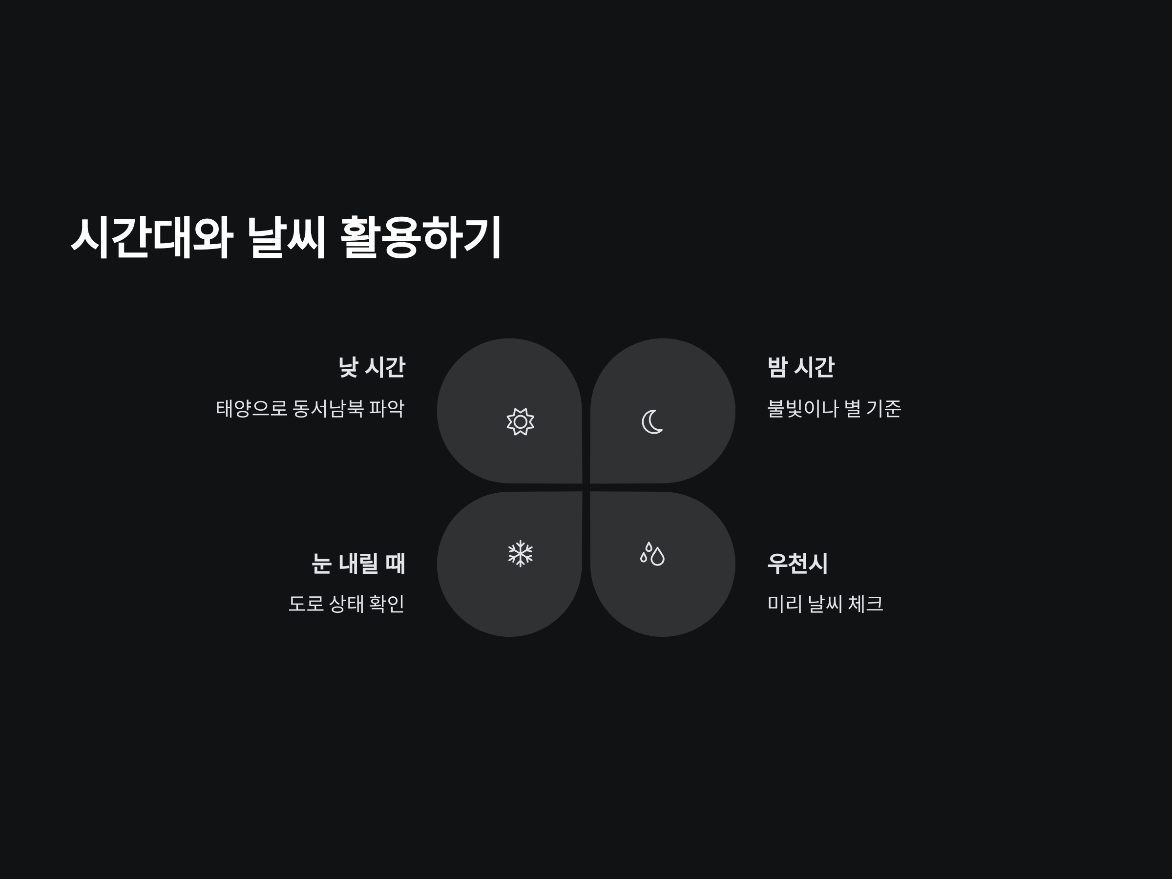 - 낮에는 태양을 기준으로 동서남북을 쉽게 파악할 수 있습니다.