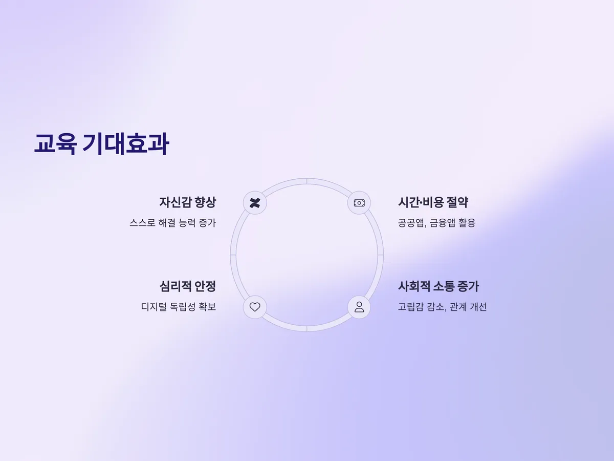 교육 수료 후 수강생들이 체감하는 변화는 매우 큽니다. 무엇보다 자신감이 생기고, 스마트폰을 활용한 다양한 일상 작업을 스스로 해결할 수 있게 됩니다. 공공앱이나 금융앱을 능숙하게 사용할 수 있게 되면 직접적인 시간과 비용 절약 효과도 생깁니다. 또한 사회와의 소통이 활발해지고 고립감을 느끼는 시간이 줄어들면서 심리적 안정감도 높아지는 효과를 봅니다.