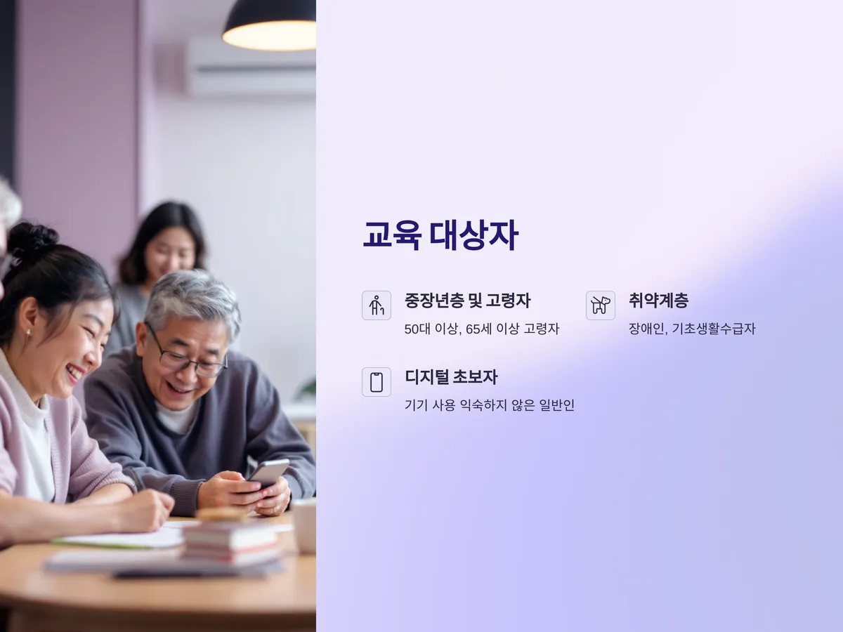 스마트폰 활용 교육은 특히 디지털 환경에서 소외되기 쉬운 계층에게 초점을 맞추고 있습니다. 대표적으로 50대 이상의 중장년층, 65세 이상의 고령자, 장애인, 기초생활수급자, 그리고 디지털 기기 사용에 익숙하지 않은 일반인 모두가 대상이 됩니다. 이들은 대부분 금융앱이나 관공서 앱 사용에 어려움을 겪고 있으며, 이는 곧 정보격차로 이어지기 때문에 교육을 통해 사회적 고립을 해소하는 효과도 기대할 수 있습니다.