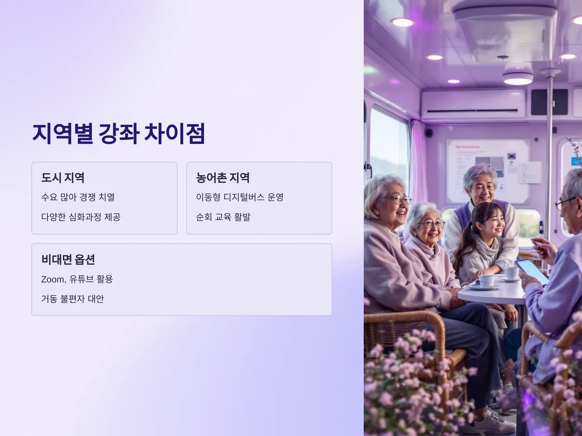 모든 지역에서 동일한 커리큘럼이 제공되는 것은 아닙니다. 각 지역의 특성과 디지털 이용 실태에 따라 교육내용과 강사, 기간, 장소 등이 달라질 수 있습니다. 예를 들어 서울은 신청 수요가 많아 경쟁이 치열할 수 있으며, 농어촌 지역은 이동형 디지털버스 등을 활용한 순회 교육이 활발하게 진행되기도 합니다.