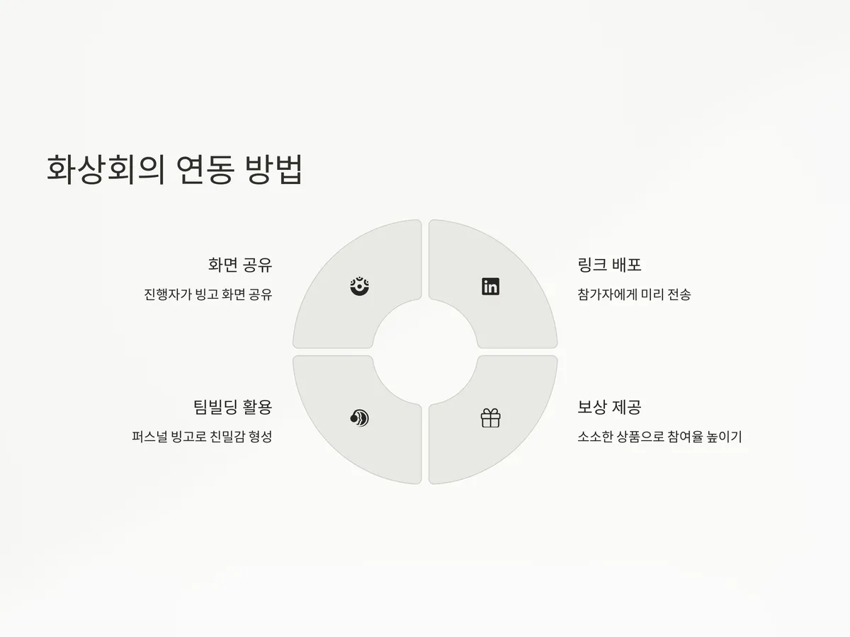 재택근무나 온라인 수업 중에도 재미있는 요소를 넣기 위해 화상회의 도구와 빙고 게임을 연동해보세요. Zoom, Google Meet, Microsoft Teams 등은 화면 공유 기능을 통해 진행자가 직접 빙고 카드 또는 콜러 화면을 공유할 수 있습니다.