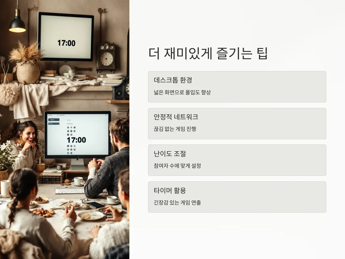 더불어 모바일보다는 데스크톱 환경에서 실행할 때 화면이 넓어 체감 몰입도가 더 높아지며, 소리나 시각효과도 생동감 있게 구현할 수 있어 권장됩니다. 참여자 수에 따라 난이도를 조절하거나 타이머를 활용해 긴장감을 더하는 것도 좋은 팁입니다.