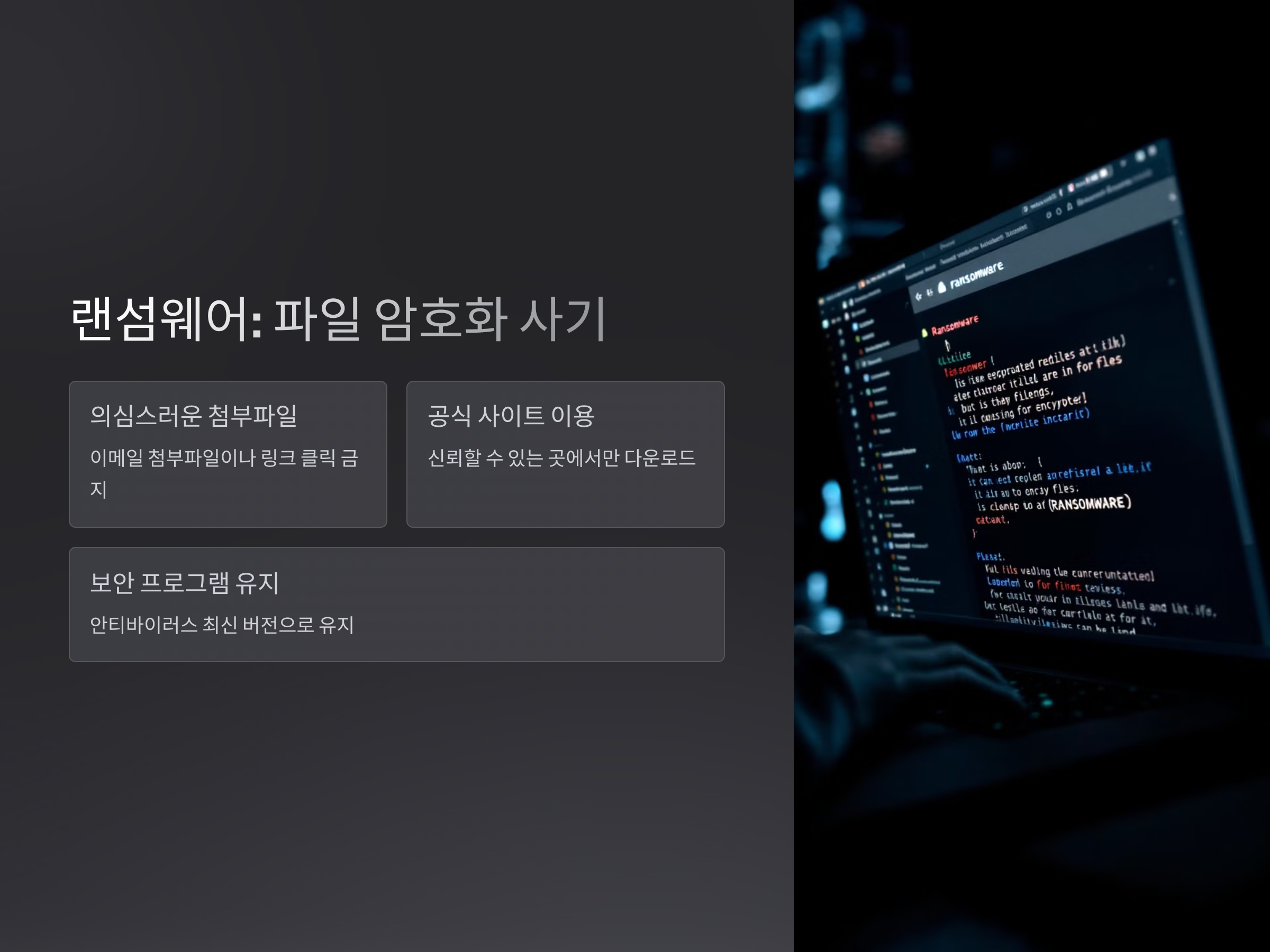 랜섬웨어: 파일을 암호화해 돈을 요구하는 사기