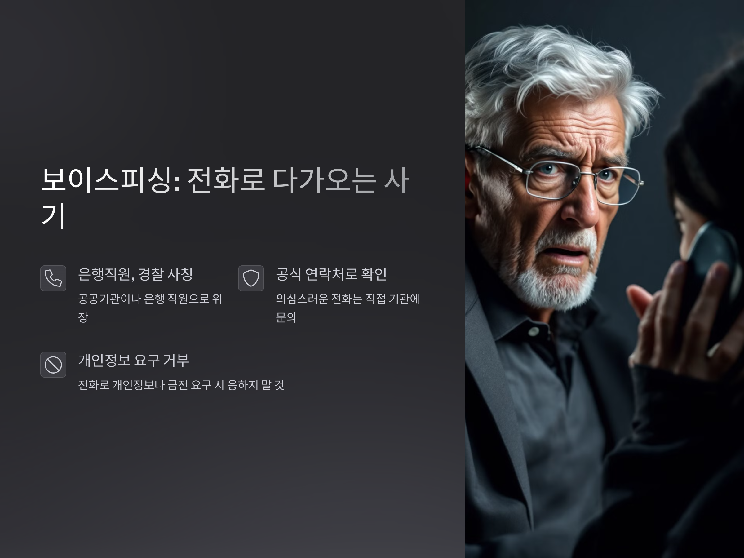 - 전화로 요구하는 개인 정보나 금전적 요구를 절대 응답하지 마세요.