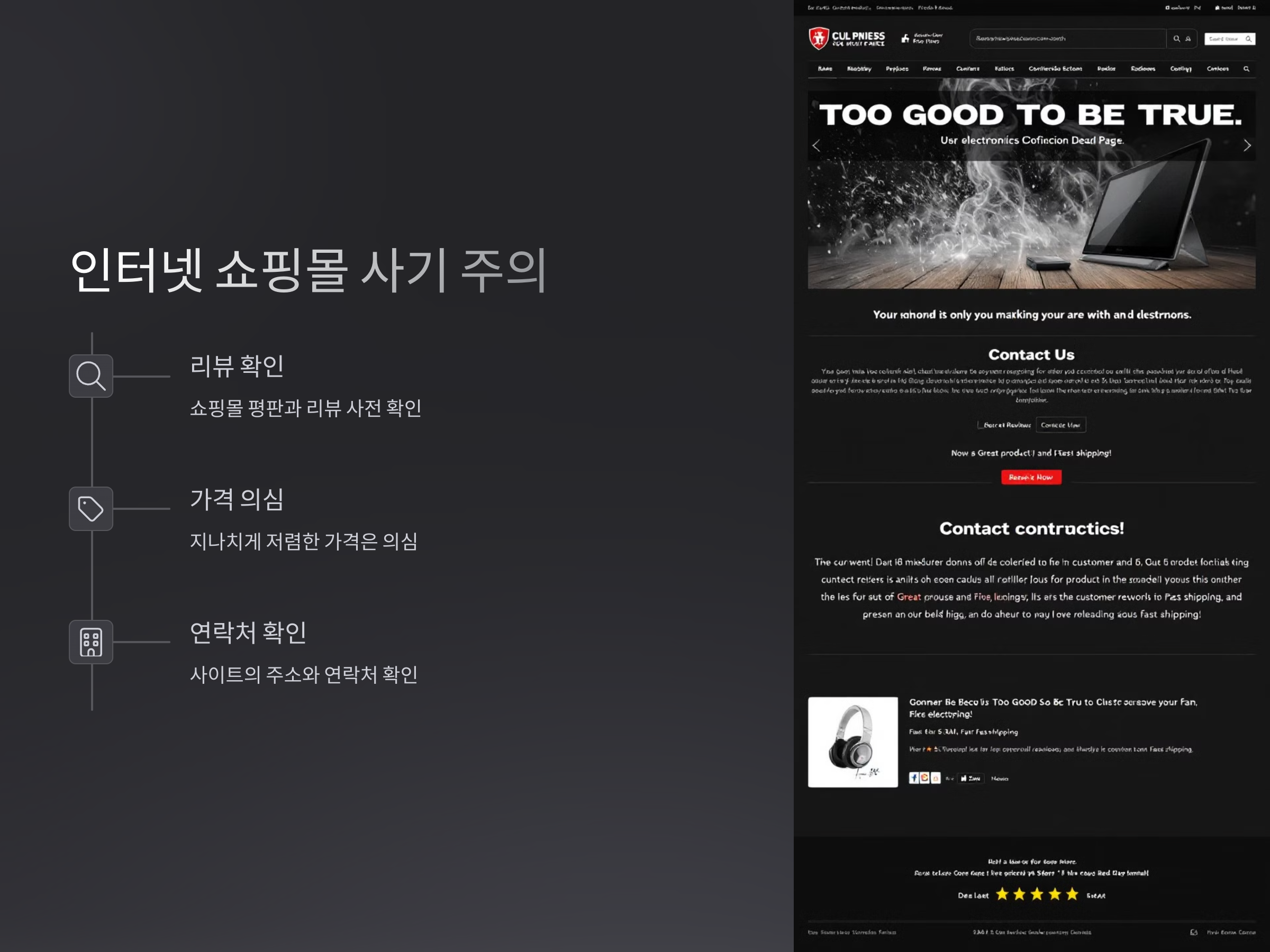 - 인터넷 쇼핑몰에서 물건을 구매할 때, 해당 사이트가 신뢰할 수 있는지 리뷰나 평판을 확인하세요.