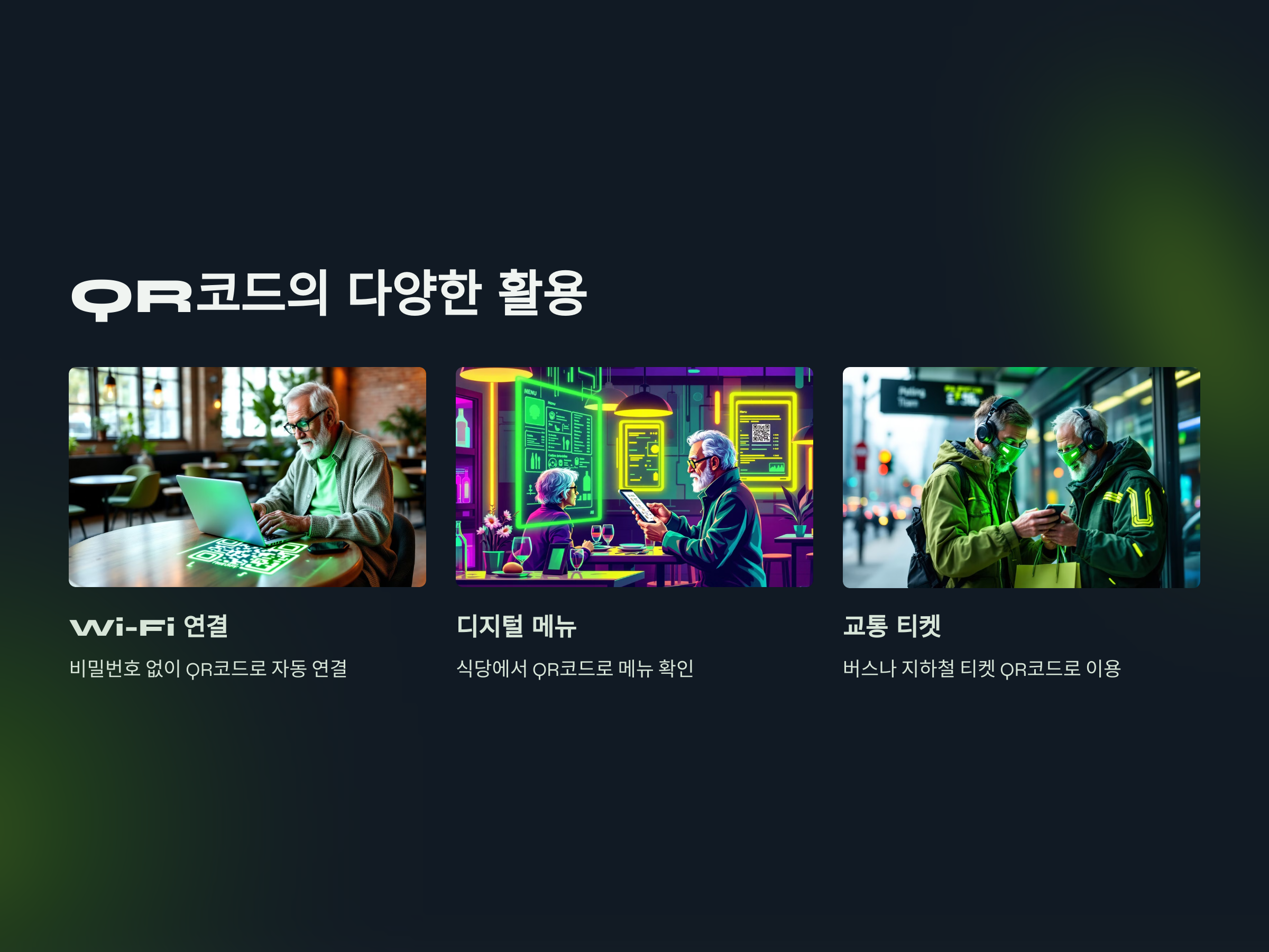 QR코드는 시니어분들도 쉽게 사용할 수 있는 편리한 기술입니다. 스마트폰 카메라를 이용하여 간단하게 정보를 얻거나, 결제를 하거나, 웹사이트에 접속할 수 있습니다. QR코드를 활용하면 일상생활이 더욱 편리해지며, 공공기관에서도 다양한 서비스를 손쉽게 이용할 수 있습니다.