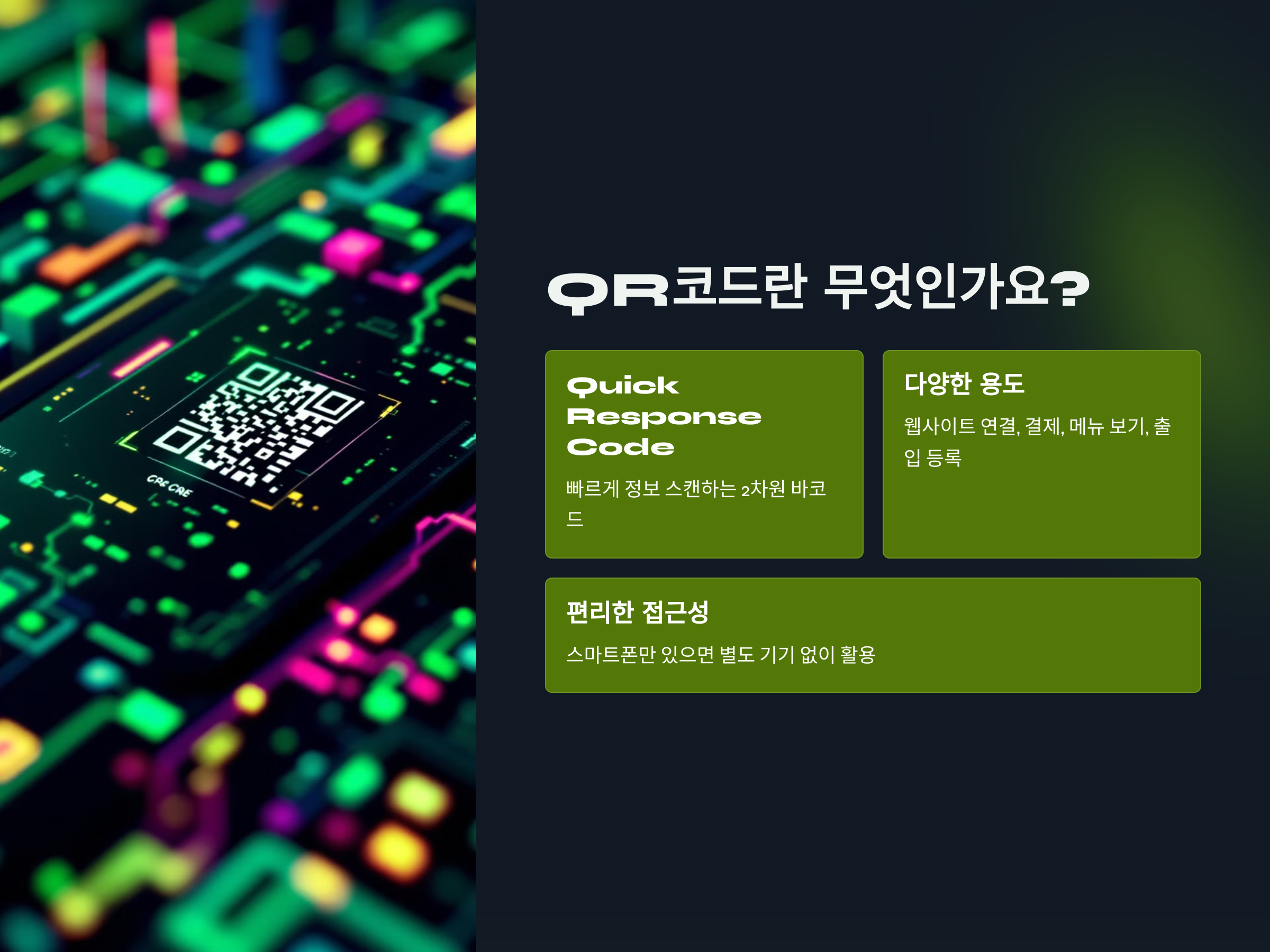 QR코드는 흑백 패턴으로 이루어진 정사각형 형태이며, 중앙에는 특정한 데이터를 포함하고 있습니다. 기존 바코드보다 더 많은 정보를 담을 수 있으며, 스마트폰만 있으면 별도의 기기 없이도 즉시 활용할 수 있는 것이 특징입니다. 특히 요즘은 코로나19 이후 QR코드를 이용한 방역패스, 전자출입명부, 모바일 결제 등이 활성화되면서 더욱 친숙한 기술이 되었습니다.