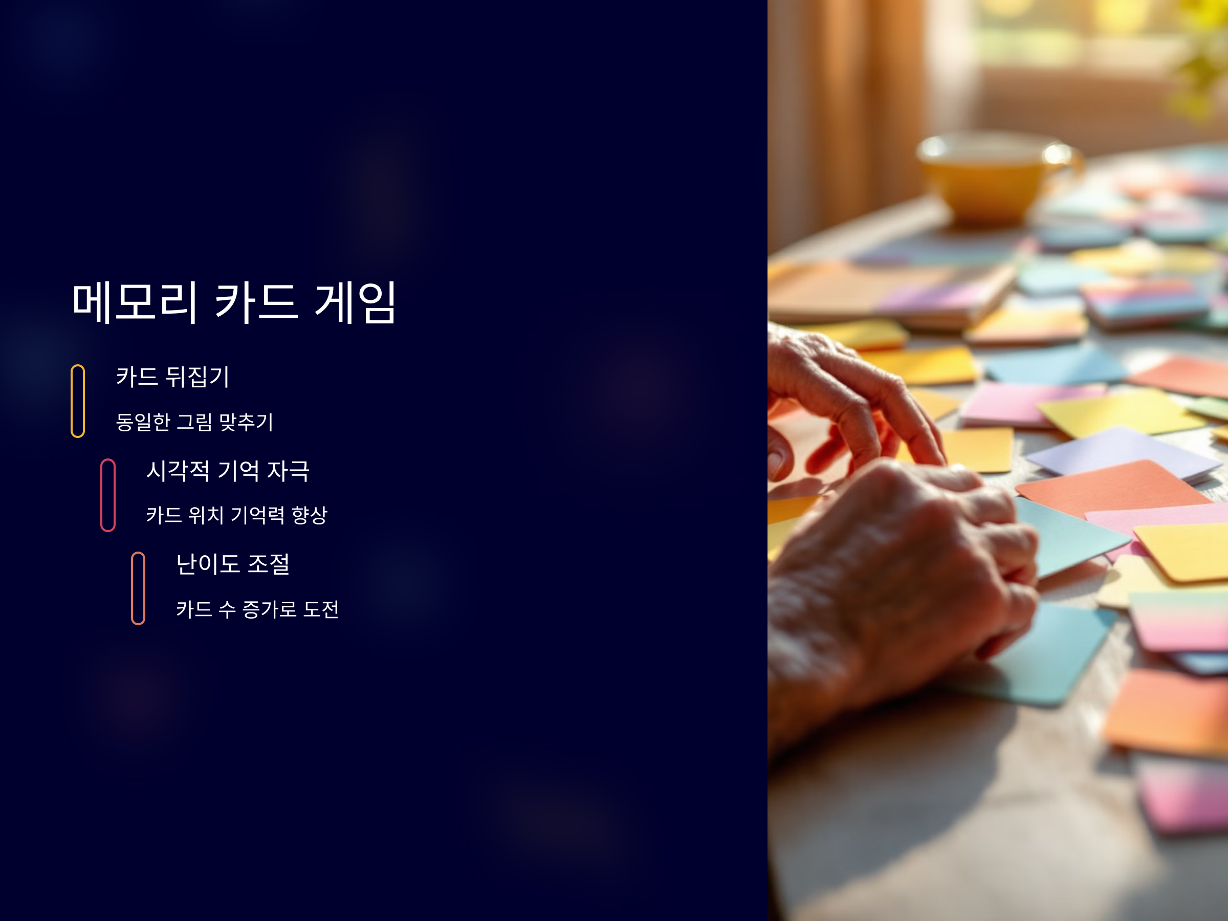 메모리 카드 게임은 시니어들이 쉽게 접근할 수 있는 기억력 향상 게임입니다. 게임의 방법은 간단합니다. 여러 개의 카드가 뒤집힌 상태로 놓여 있고, 카드를 두 개씩 뒤집으면서 동일한 그림을 맞추는 방식입니다. 이 게임은 시각적 기억을 자극하고, 카드의 위치를 기억하는 능력을 향상시킬 수 있습니다. 초기에는 간단한 카드 숫자부터 시작해 점점 난이도를 높여가는 방식으로 진행할 수 있어 재미와 도전을 동시에 느낄 수 있습니다.