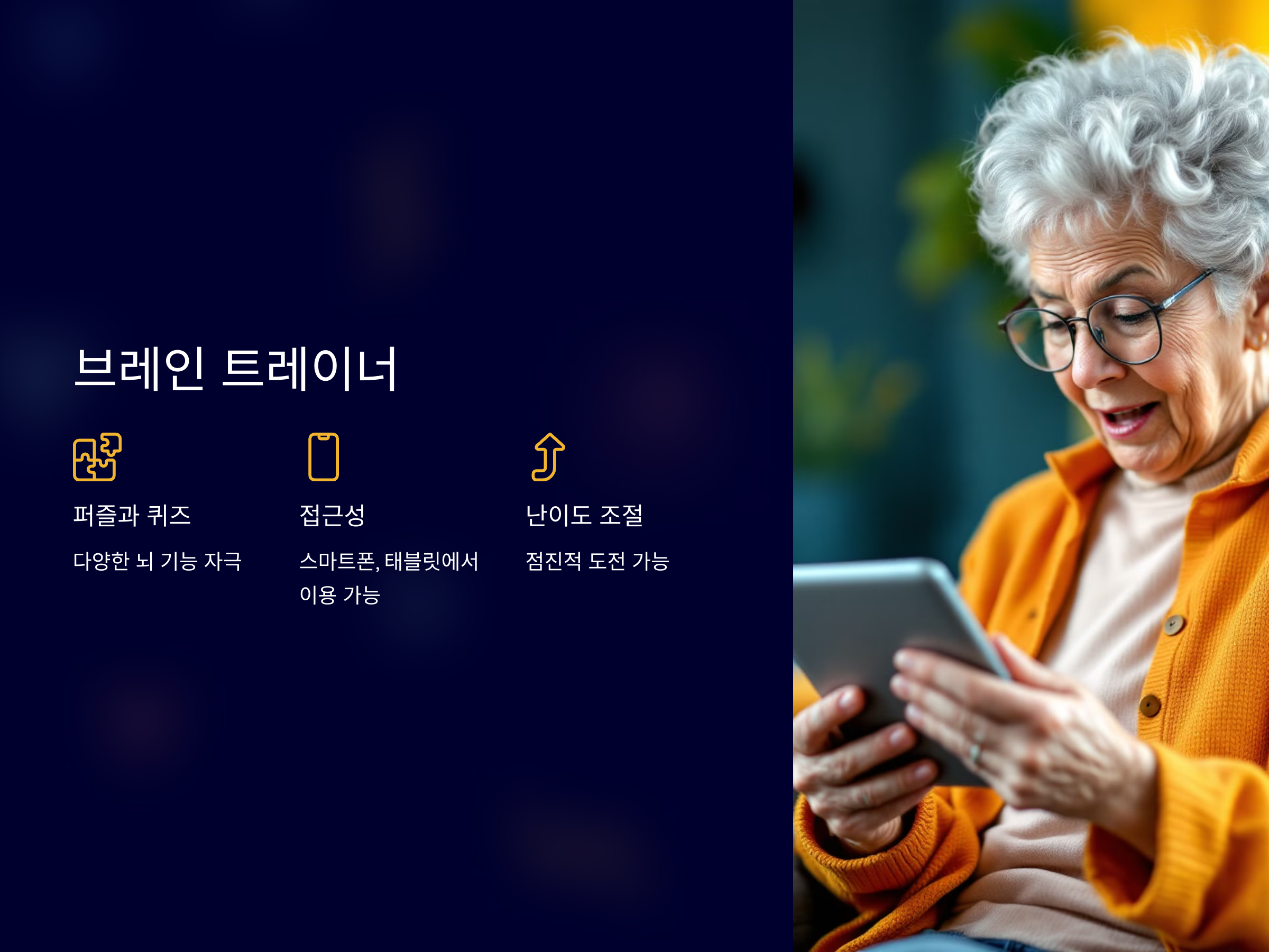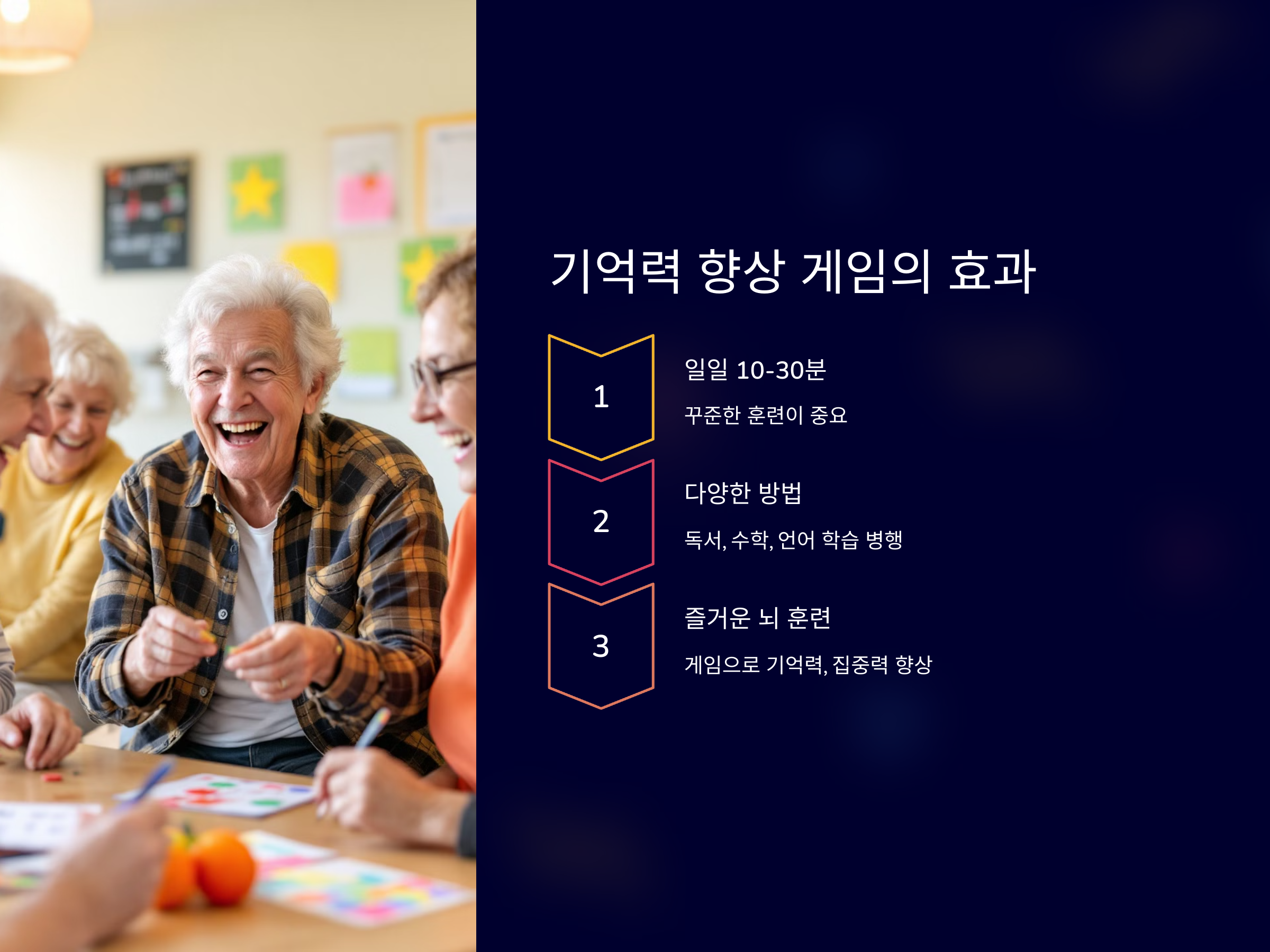시니어들이 기억력과 뇌 건강을 지키는 데 게임만큼 좋은 도구는 없습니다. 즐겁게 게임을 하면서 뇌 훈련을 할 수 있고, 이를 통해 기억력과 집중력을 향상시킬 수 있습니다. 매일 조금씩 기억력 향상 게임을 즐기며 뇌 건강을 지키세요.