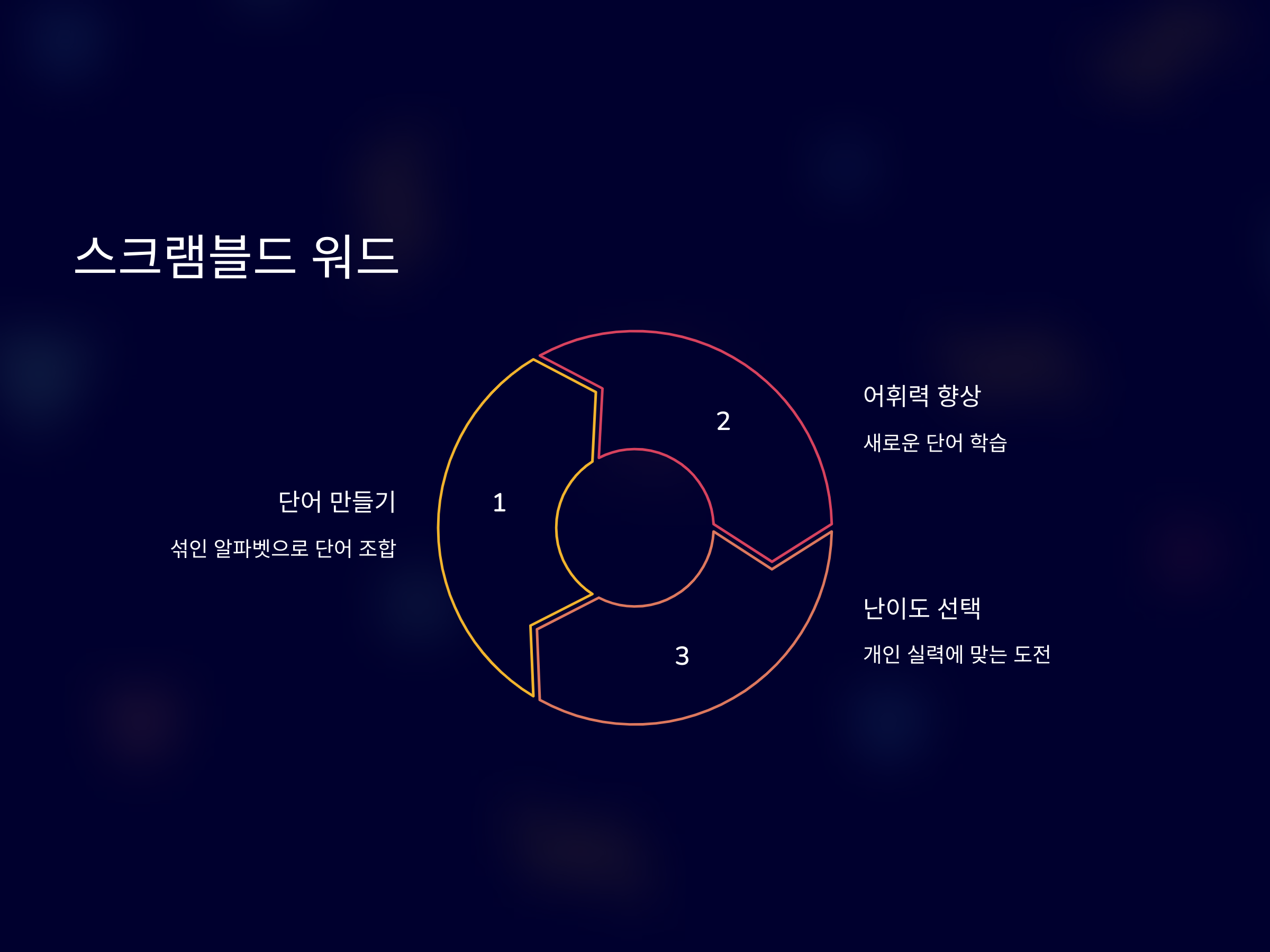 이 게임은 섞인 알파벳을 보고 단어를 만들거나, 주어진 글자들로 새로운 단어를 찾아가는 방식입니다. 스크램블드 워드는 어휘력을 높이는 데 매우 유용하며, 문맥을 통해 새로운 단어를 기억하는 능력을 키울 수 있습니다. 특히, 고령의 사용자들이 즐기기에 적합하며, 난이도를 선택하여 자신의 실력에 맞는 도전을 할 수 있습니다. 이 게임은 단어를 더 빨리 찾고, 더욱 정교하게 생각할 수 있도록 도와줍니다.