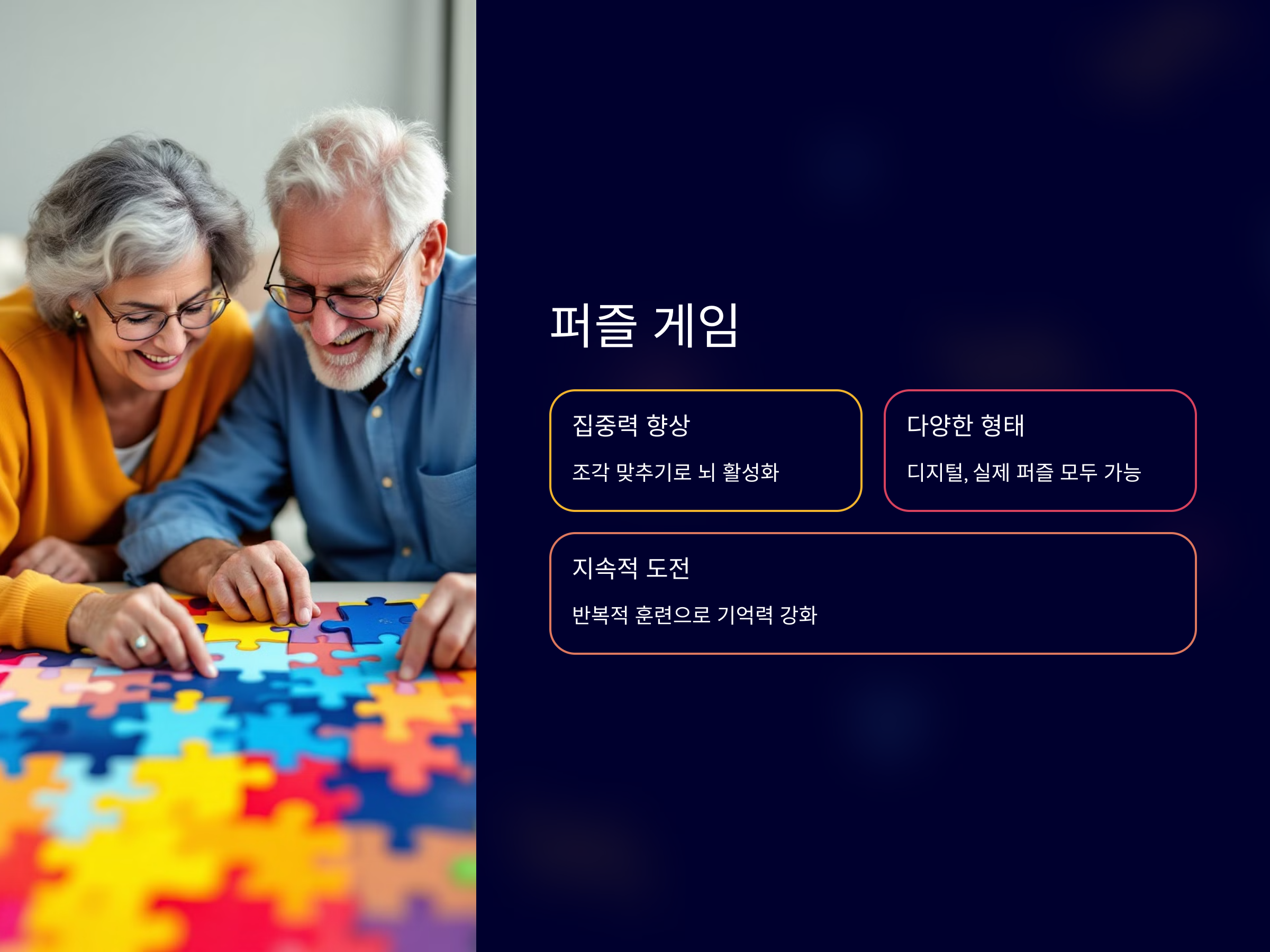 퍼즐 게임은 뇌를 자극하고 집중력을 향상시키는 데 효과적인 게임입니다. 조각을 맞추거나, 특정한 규칙에 맞게 퍼즐을 완성하는 게임은 뇌를 계속해서 활동하게 만듭니다. 이 게임은 시니어들이 뇌의 여러 영역을 자극할 수 있게 해주며, 반복적인 도전 과정을 통해 기억력과 집중력을 강화할 수 있습니다. 퍼즐은 스마트폰뿐만 아니라 실제 물리적인 퍼즐을 사용하여 즐길 수도 있어 다양하게 활용 가능합니다.